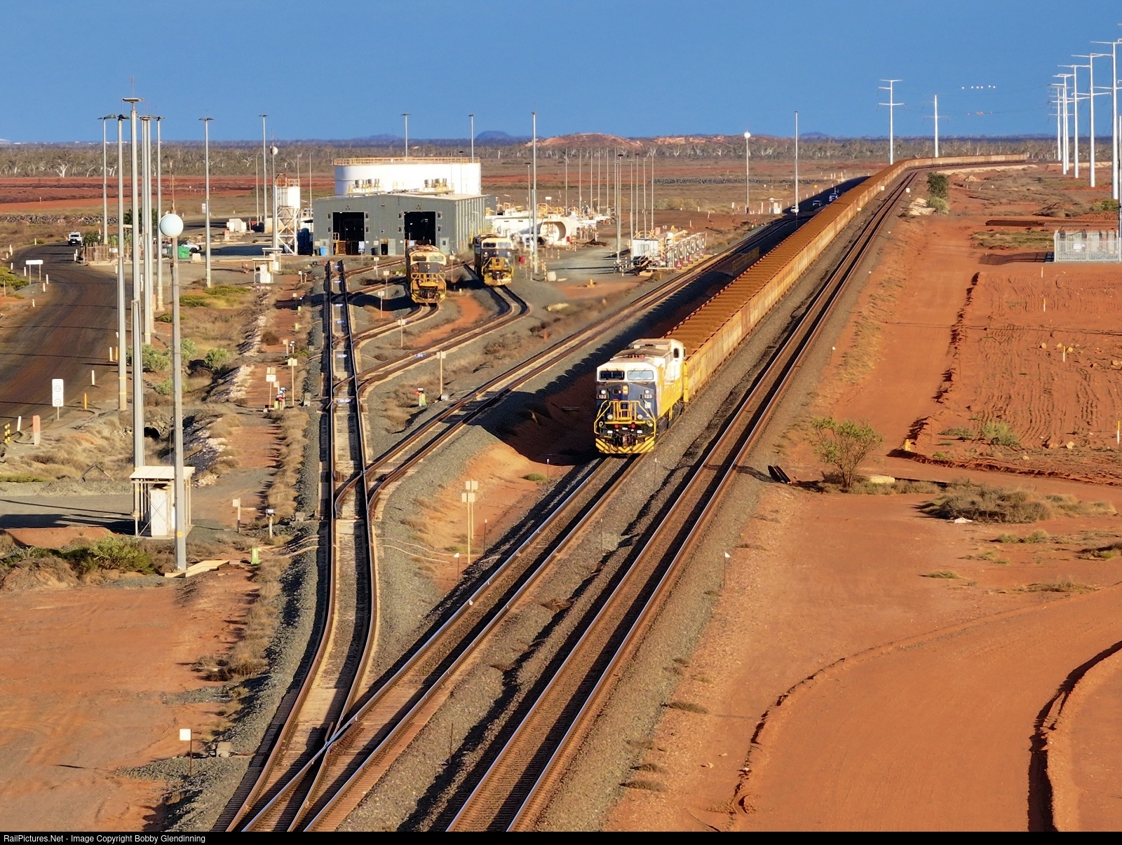 A loaded FMG ore train passes the locomotive shop just a few kilometers before the dumpers.
