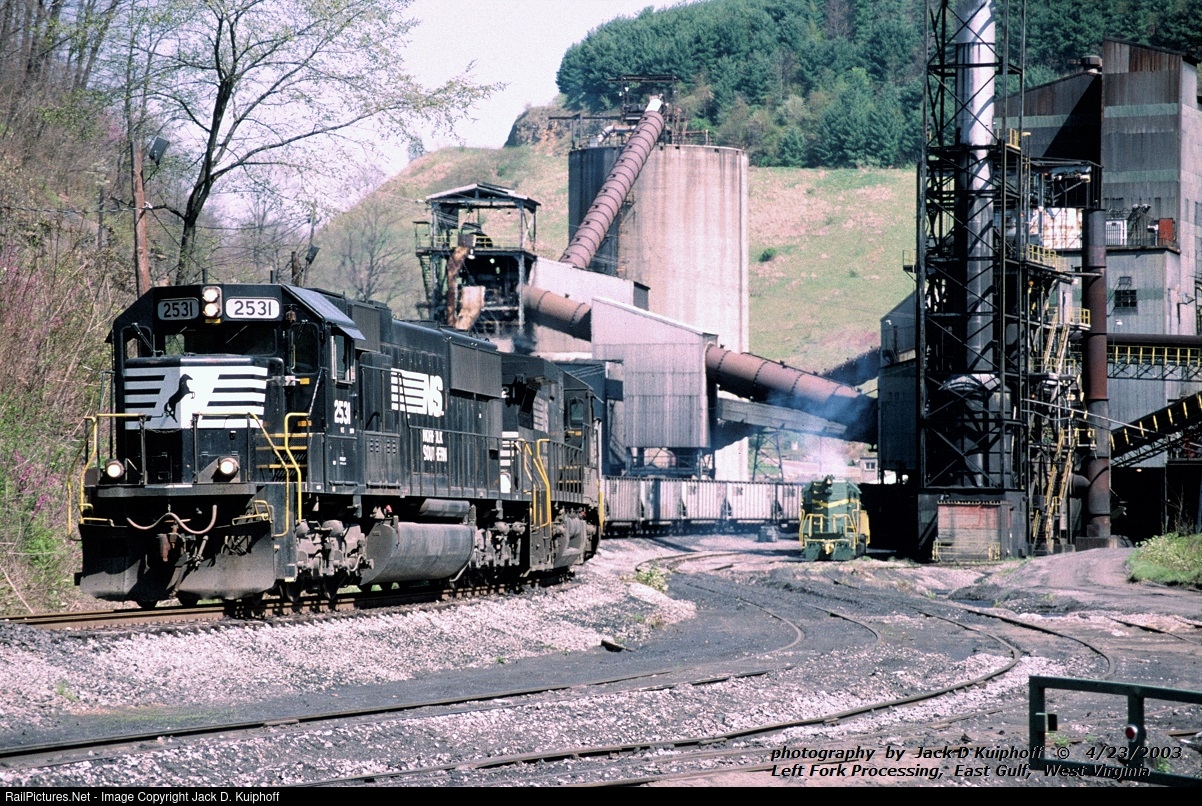 Norfolk Southern, NS SD70 2531, with the U93 Stone Coal Shifter, at Left Fork Processing, East Gulf, West Virginia. April 23, 2003. Jack D Kuiphoff © photo