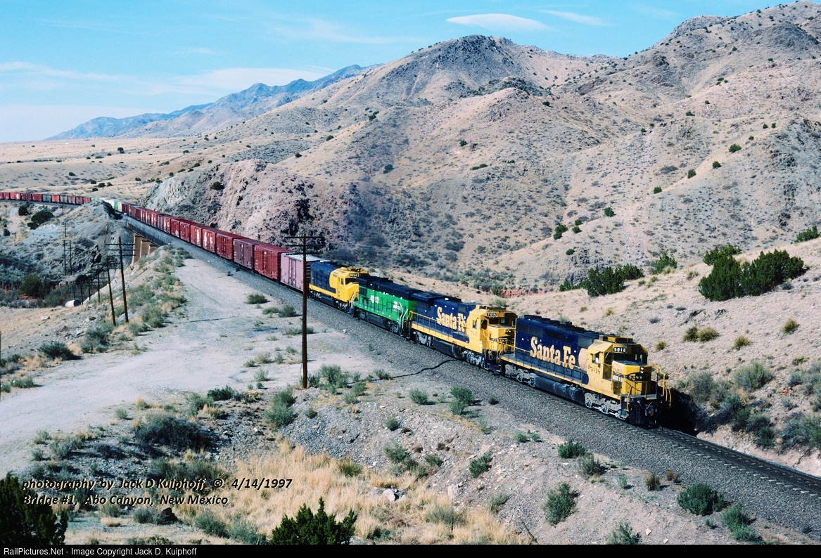 | Santa Fe, AT&SF SD40u 5018 -B40-8 7415 -B30-7AB 4013 -FP45 5954, with an eastbound freight at Bridge 1, in Abo Canyon, New Mexico. April 14, 1997. Jack D Kuiphoff photo ©
