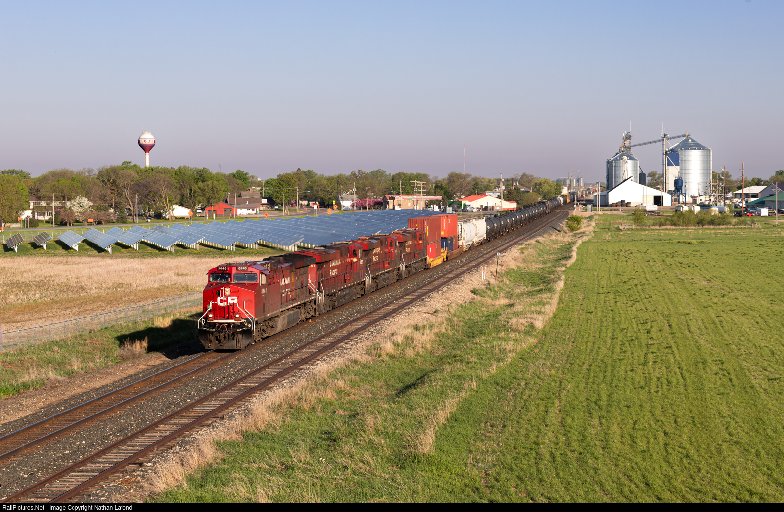 | Canadian Pacific train 148 rips through Belgrade, Minnesota, at track speed behind four bright red GE's. |