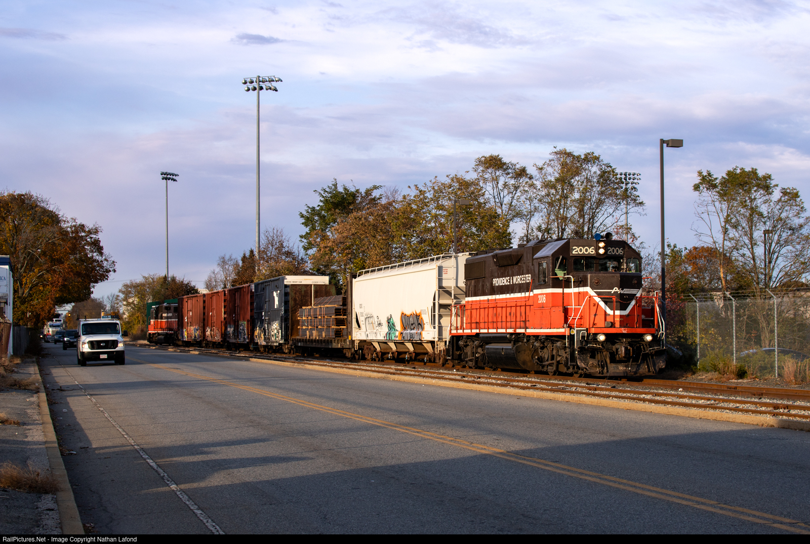 | Providence and Worcester local PR-3 dodges shadows from the fading sunlight on a late Fall afternoon. P&W GP38-2 siblings #2006 and #2007 bracket a handful of cars for Teknor Apex, Metals USA and Key Container. The crew would continue on to service just about every customer on the branch before having to head to the Port of Providence later that night.
