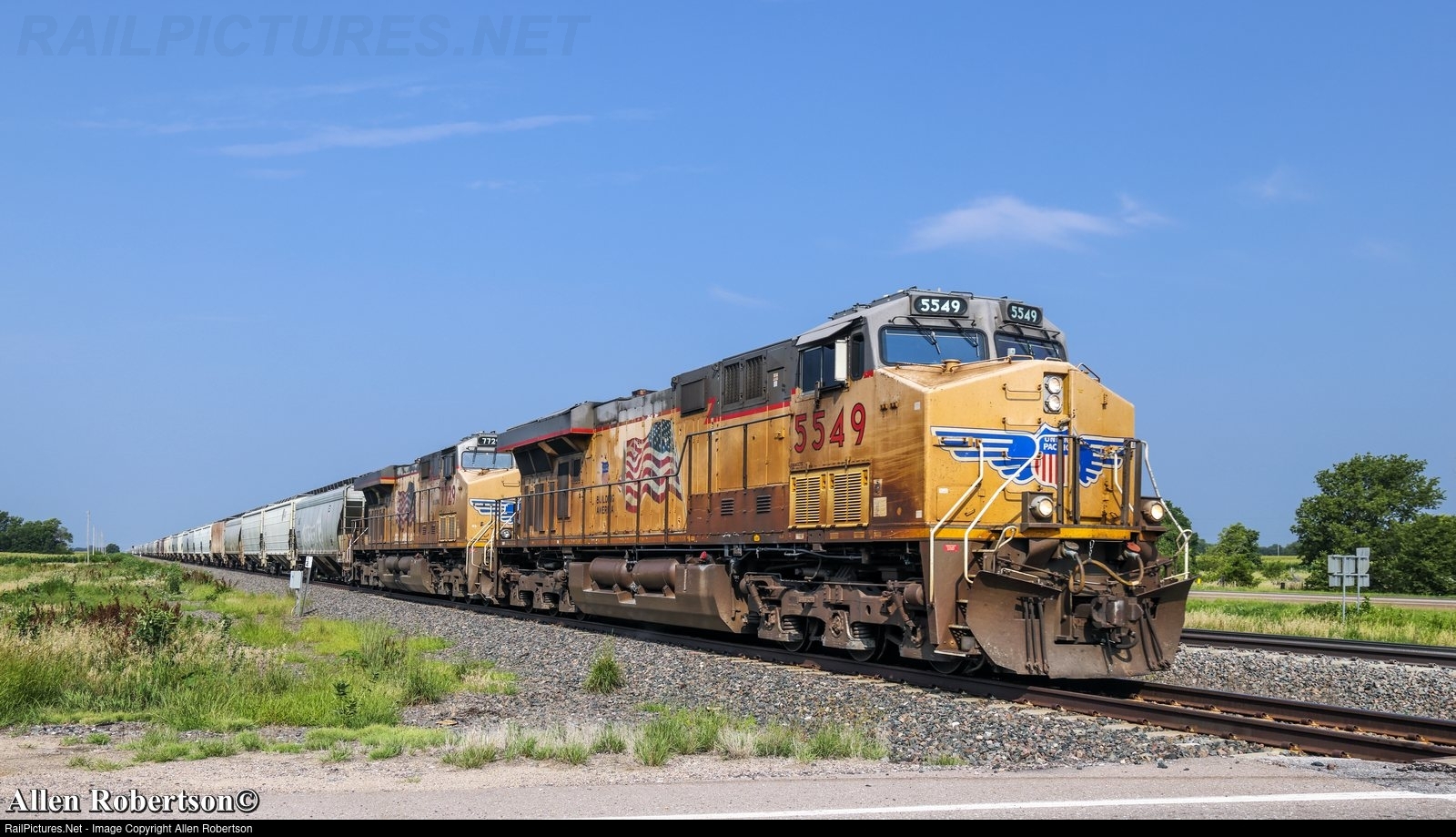 UP 5549 & 7729 eastbound with a unit grain train.