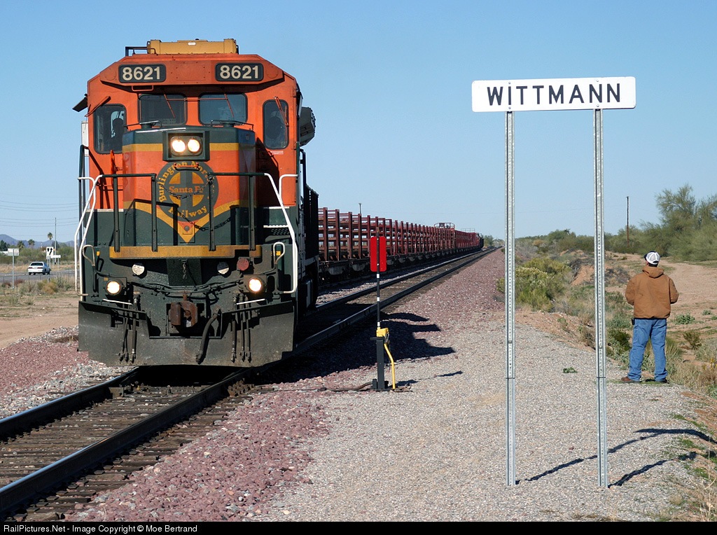 Under a watchful eye, BNSF 8621 West pulls a rail train onto the main at Wittmann for a short trip south to meet an eastbound bare table at Beardsley. My Peavine webpage: http://www.aeromoe.com/Peavine.html