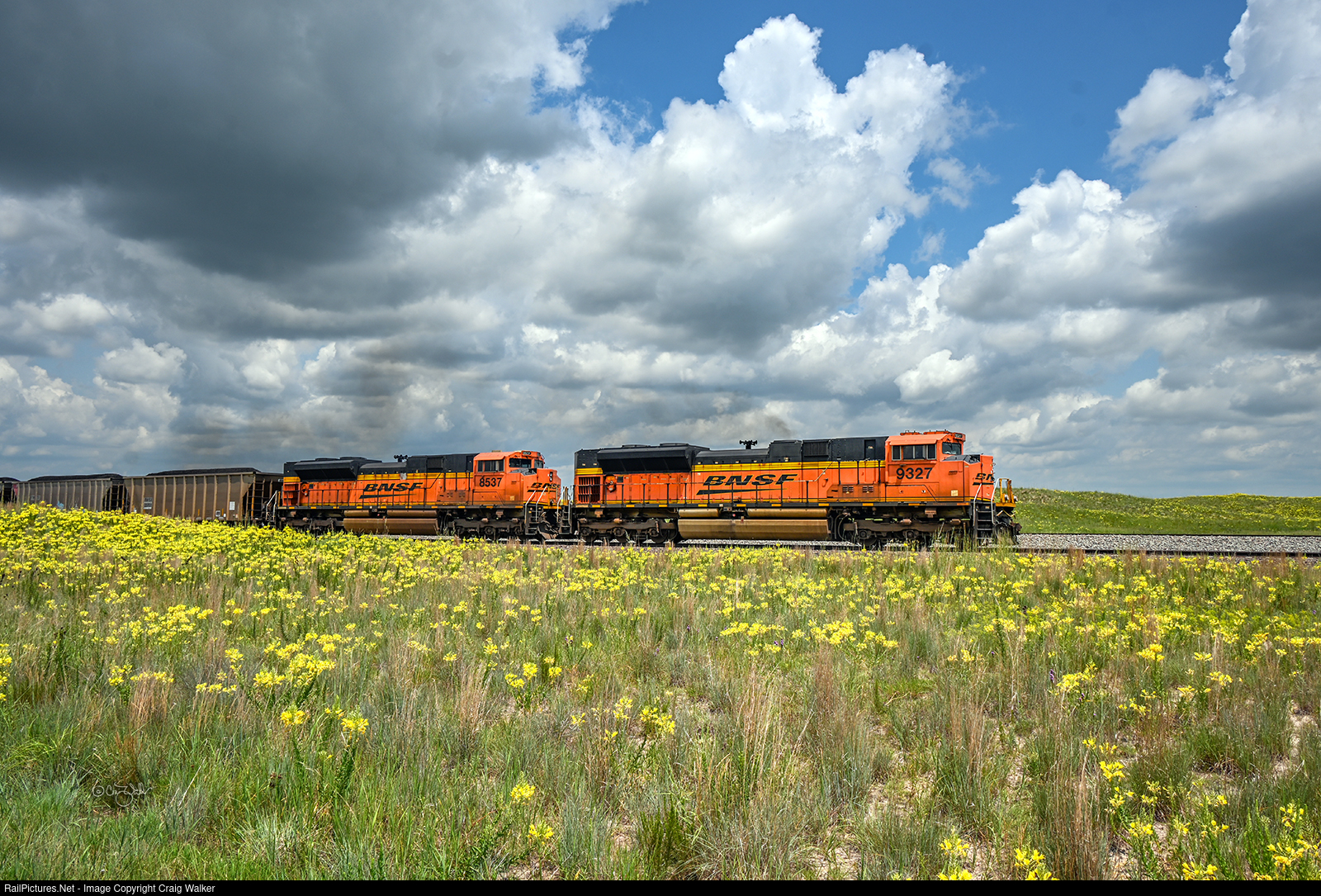 Nebraska's Sand Hills are covered in a yellow carpet of wildflowers (fourpoint evening-primrose, Oenothera rhombipetala) as BNSF Railway coal train C-EBMMHS-065A, a loaded coal train heading from Eagle Butte Mine at Eagle Butte Junction WY to Memphis TN (on the Norfolk Southern) parallels Nebraska Highway 2. A pair of EMD SD70ACe locomotives (9327 and 8537) lead this 135-car train, with an additional two as the rear-end Distributed Power Units (8406 and 8594), handling the 19,265-ton (17476.914 metric tons), 7,191-foot (2191.817-meter) train. The spectacular clouds in the sky would, later this afternoon (and after I headed further south), wreak havoc in nearby Broken Bow as a powerful storm unleashed a brief EF-1 tornado on the far western edge of town, which was in contact with the ground for less than two seconds, but was powerful enough to toss an 800-pound trailer into the far front quarter panel of an adjacent car. The thunderstorm produced several down bursts, which stripped crops to stubble and toppled many trees, as well as snapping or toppling numerous power poles. (Anselmo, Nebraska – July 16, 2024)