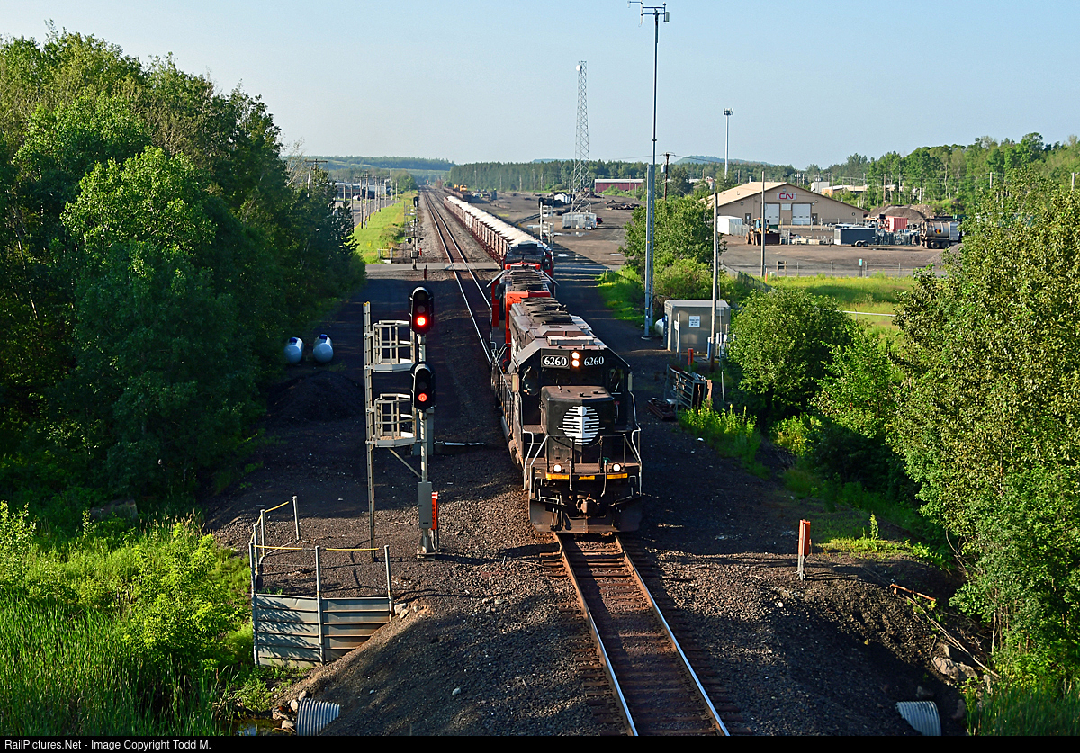 | After a meet with an empty coke train that was heading south, IC 6260 pulls off the siding in the former DWP yard at Virginia to continue north for the Minorca mine with limestone loads. |