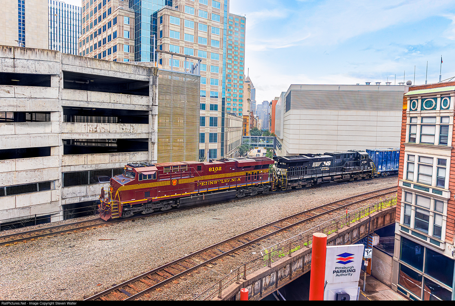 | Norfolk Southern's "Pennsylvania Railroad" heritage unit rolls east through Downtown Pittsburgh. The PRR’s impact on Pittsburgh was substantial, helping to drive the city’s growth and development through its transportation network. Even though the Pennsylvania Railroad as a corporate entity no longer exists, its historical significance continues to be felt in Pittsburgh and beyond.