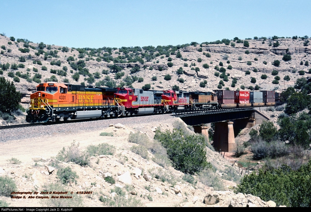 | BNSF 4331-731-146-4577 westbound on the Clovis sub crossing bridge 5 in Abo Canyon, New Mexico. April 15, 2001. Jack D Kuiphoff © photo |
