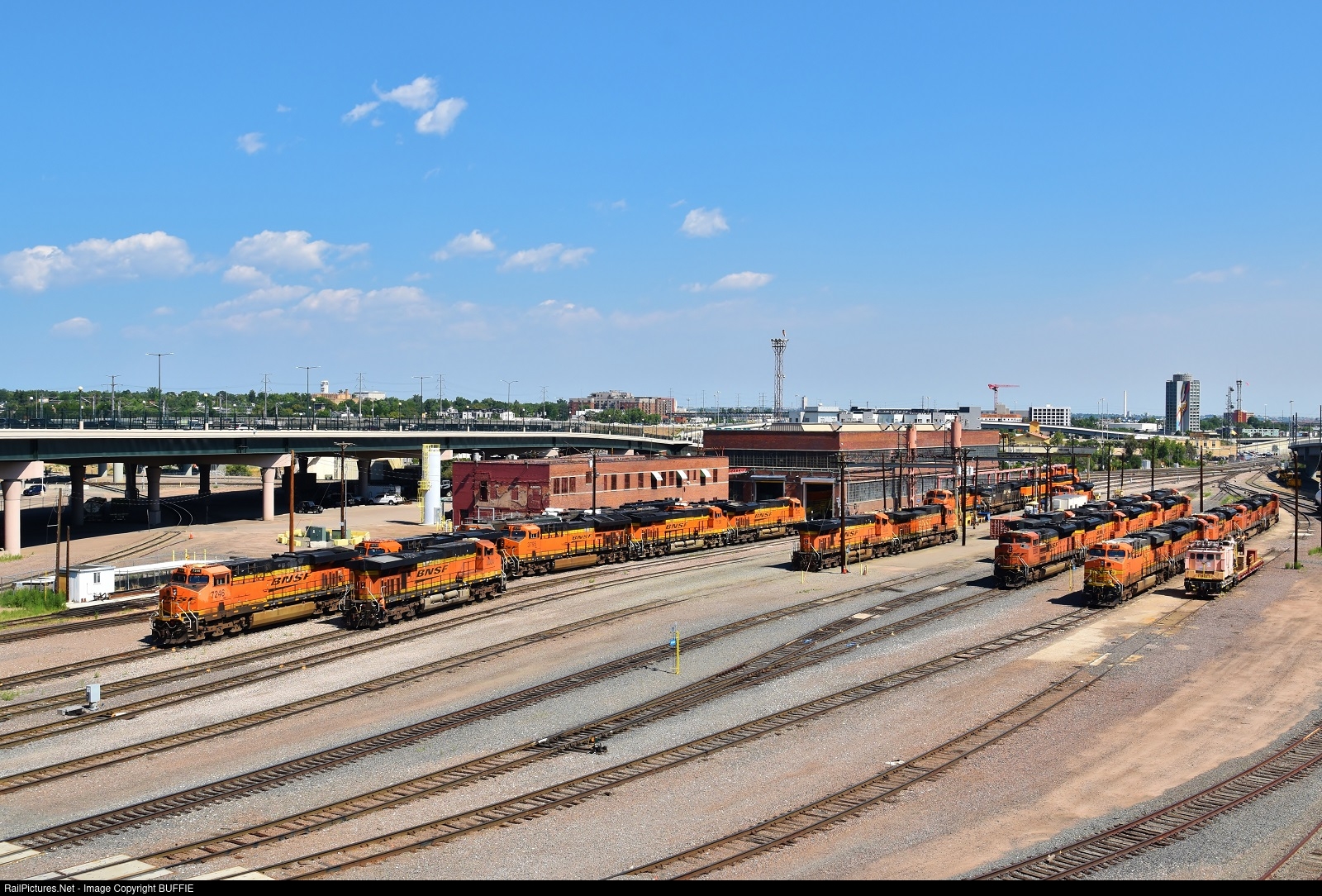 | The engine facility in Denver, Colorado is getting crowded with motors either waiting for service or waiting for orders to catch a train in the Denver Yard.