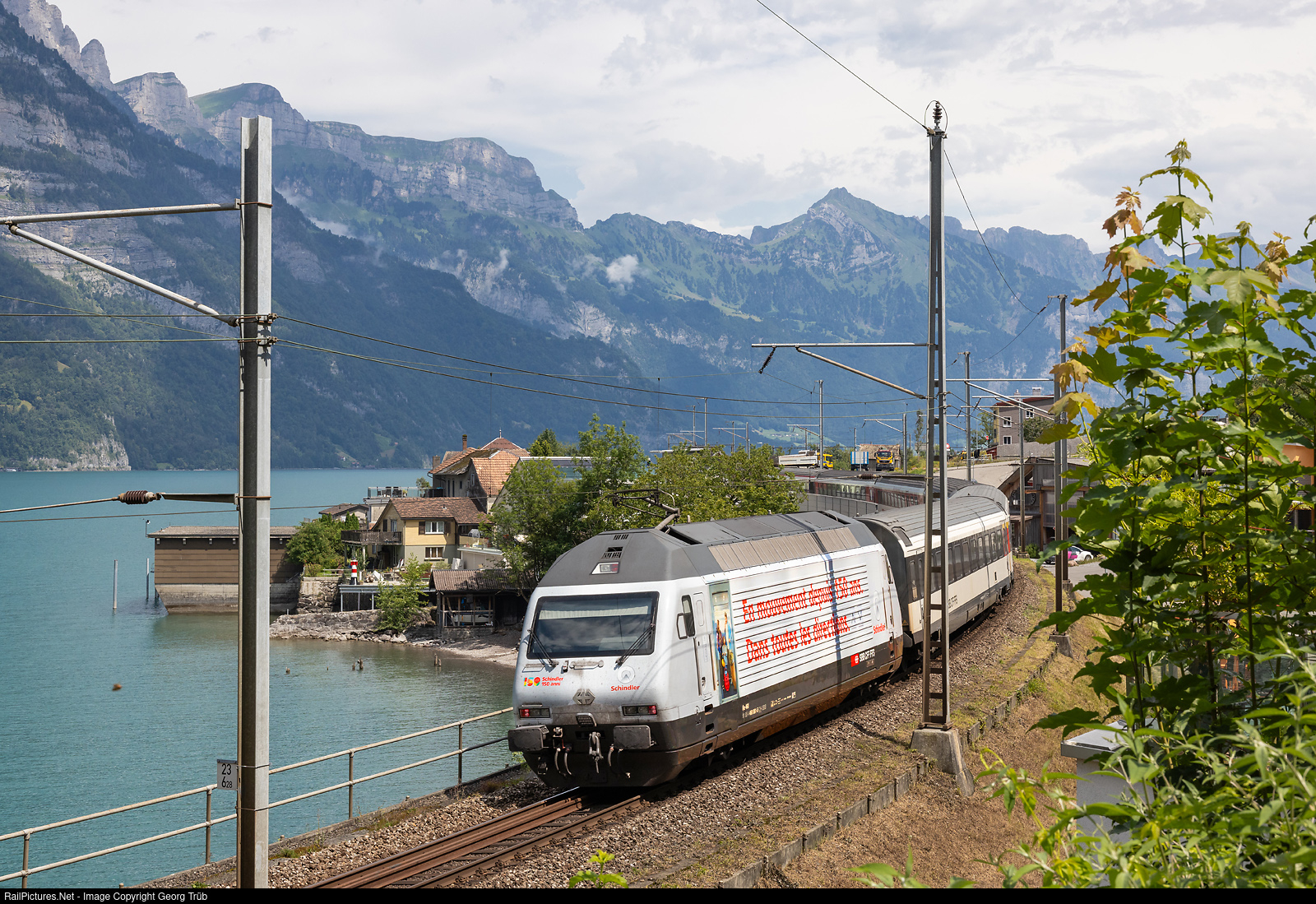 Re 460 # 061 of the SBB, in the publicity paint scheme for 150 years Schindler, is in the rear of the IC 571 of the line IC3 from Basel via Zürich to Chur, between Muhlehorn and Murg on the shore of the Walensee. Re 460 # 086 was in front of the push-pull train, and a 3-car modul with cab car leading.