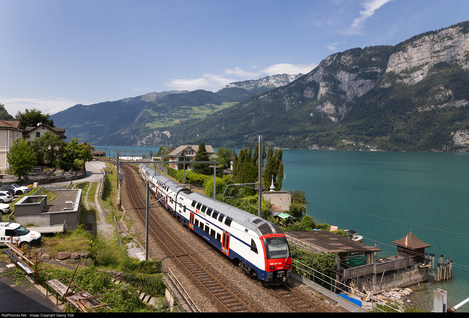 | Doubledeck commuter train "DTZ" RABe 514 # 019 of the SBB is running through Mühlehorn on the shore of the Walensee as S2 service 18247 from Zürich Airport via Zürich main station and Ziegelbrücke to Unterterzen. |