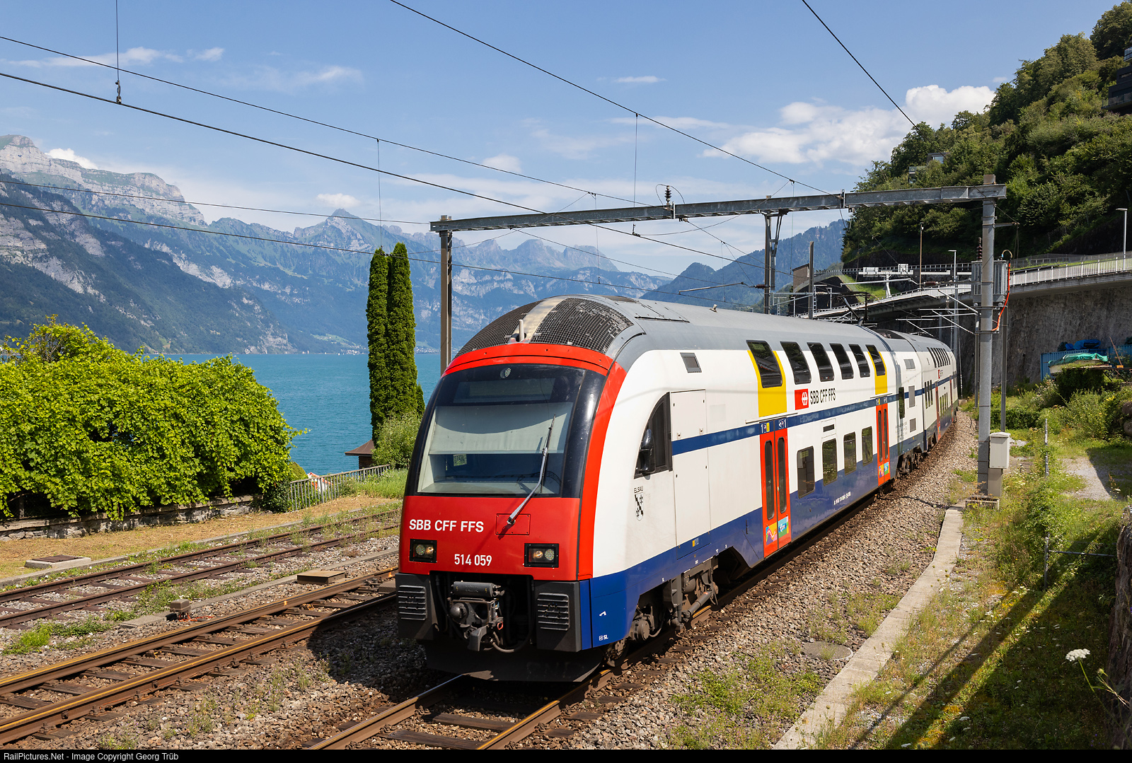 | Doubledeck commuter train "DTZ" RABe 514 # 059 of the SBB is running through Mühlehorn on the shore of the Walensee as S2 service 18260 from Unterterzen via Ziegelbrücke-Zürich main station to Zürich Airport. |