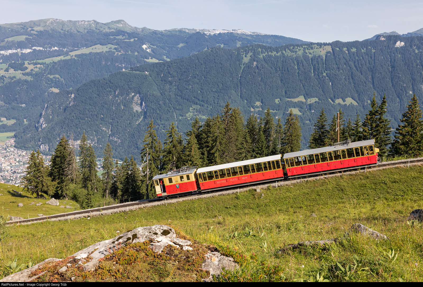 | First part of train 638 of the cogwheel Schynige Platte-Bahn SPB) is running down from the Schynige Platte to Wilderswil, above Breitlauenen, with locomotives He 2/2 # 19 "Flühblume" built by SLM and Alioth in 1911 for the Wengernalpbahn as # 59 and came to the SPB in 1963. |