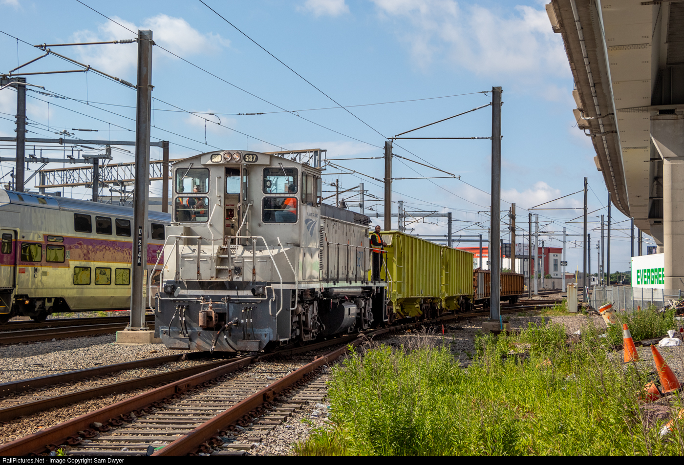Amtrak's fleet of work engines has been changing quite a bit lately. Newly-acquired GP38-3s have quickly replaced classic EMDs, and 537 is the last active MP15 on Amtrak's system. Here it is departing Boston with four company MOW cars. |