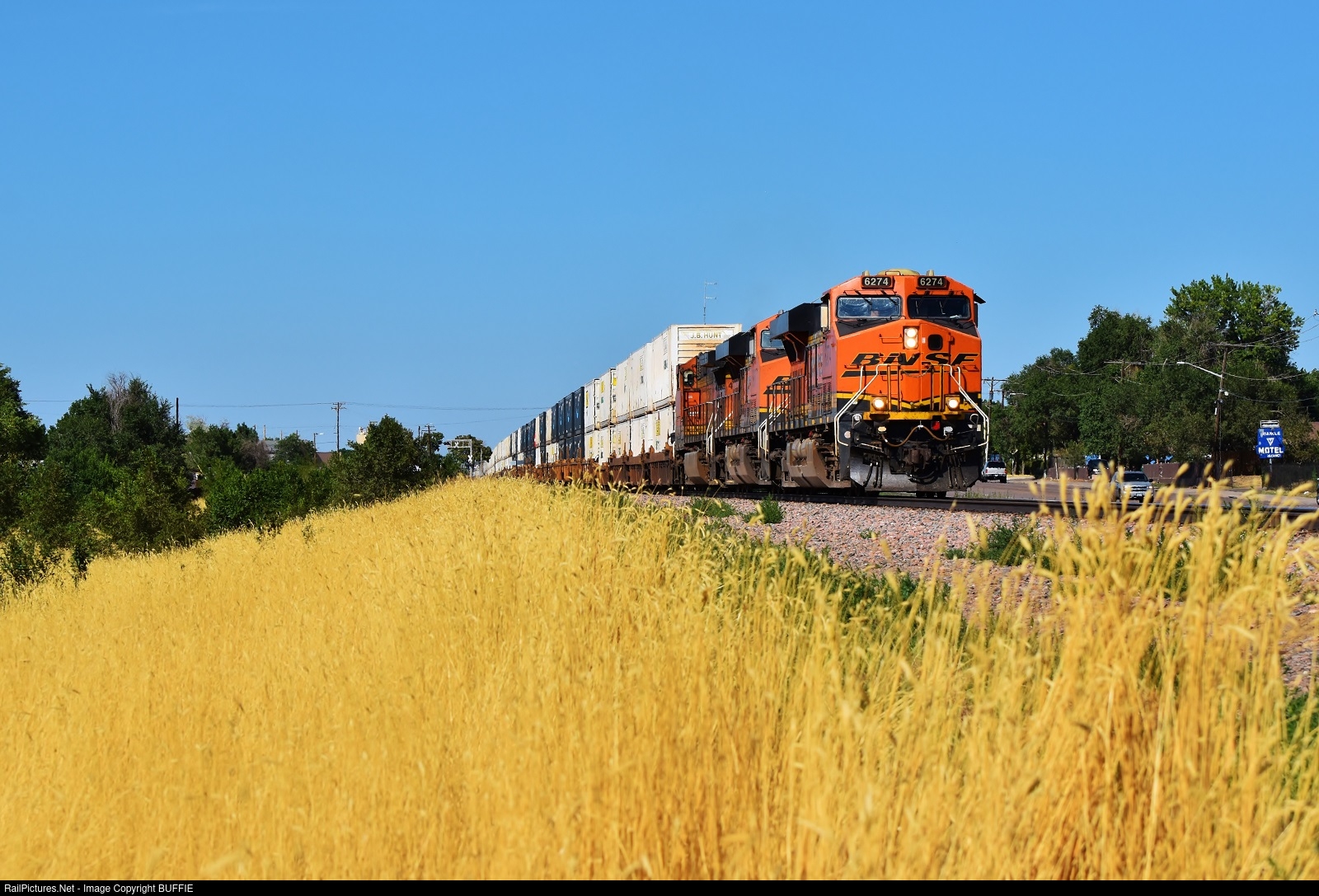 | BNSF 6274 (ES44AC) leads a stack train past amber waves of wild grasses that are trackside in Commerce City, Colorado.