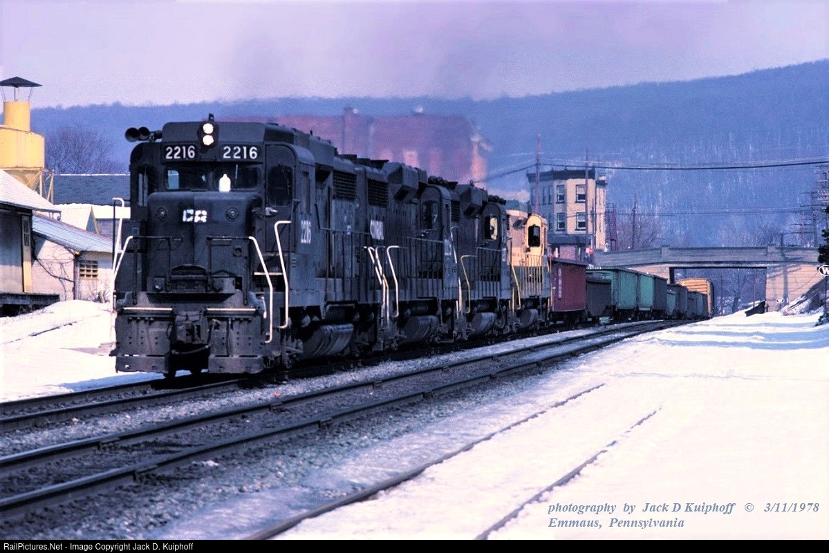 | Conrail, CR, GP30's 2216-2225-2217-2170, with westbound APB-1 on the ex-Reading Line at, Emmaus, Pennsylvania. March 11, 1978. Jack D Kuiphoff photo |
