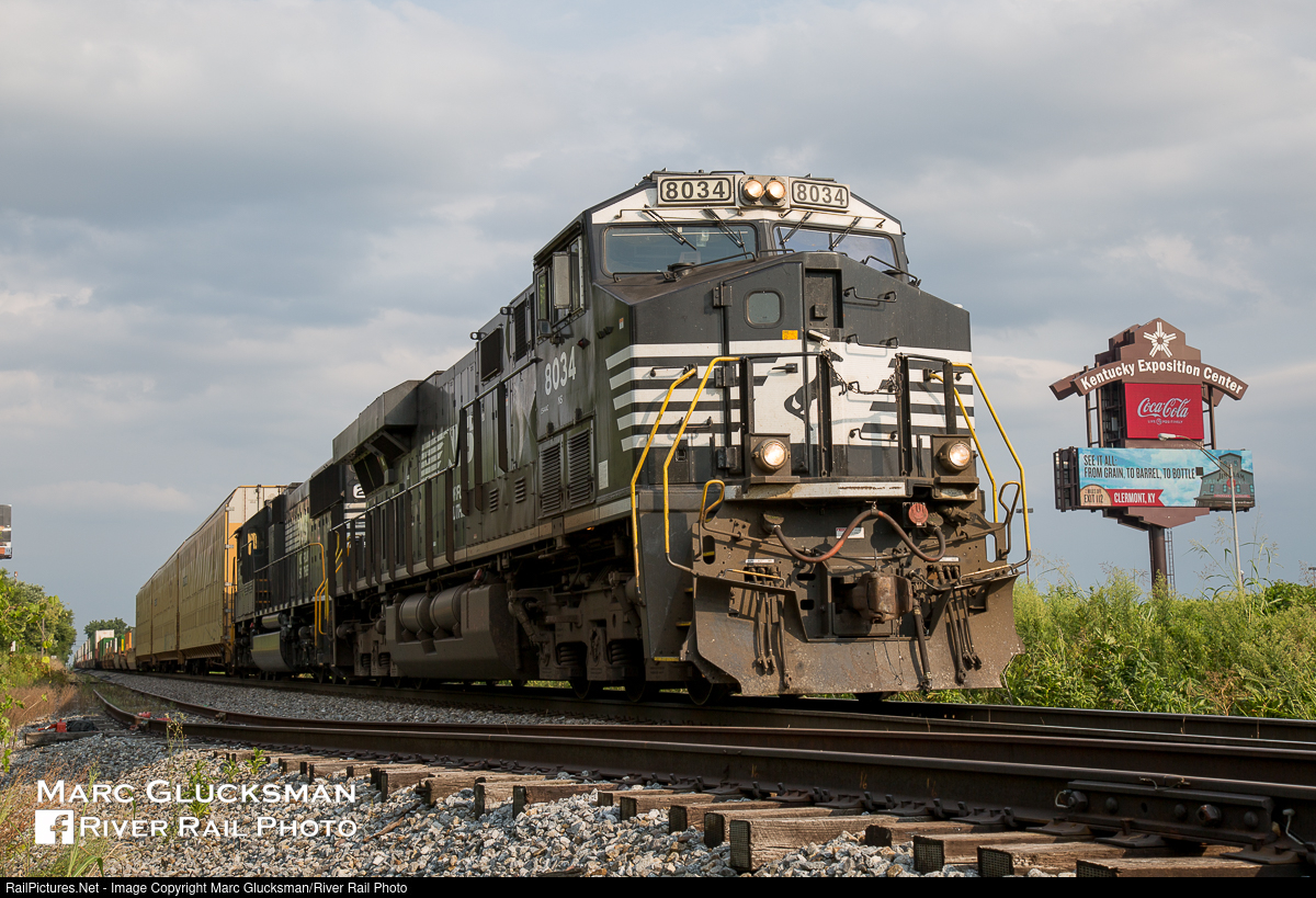 Jim And Coke. With an appropriately local advertisement for Jim Beame, which is only about 25 miles away, on the sign for the Kentucky Exposition Center, Norfolk Southern 8034 (ES44AC, GE, 11/2010) sits waiting for a recrew on the evening of August 4, 2015. And of course, even the sign knows, nothing is better to go in a Jim Beame cocktail than a Coke!