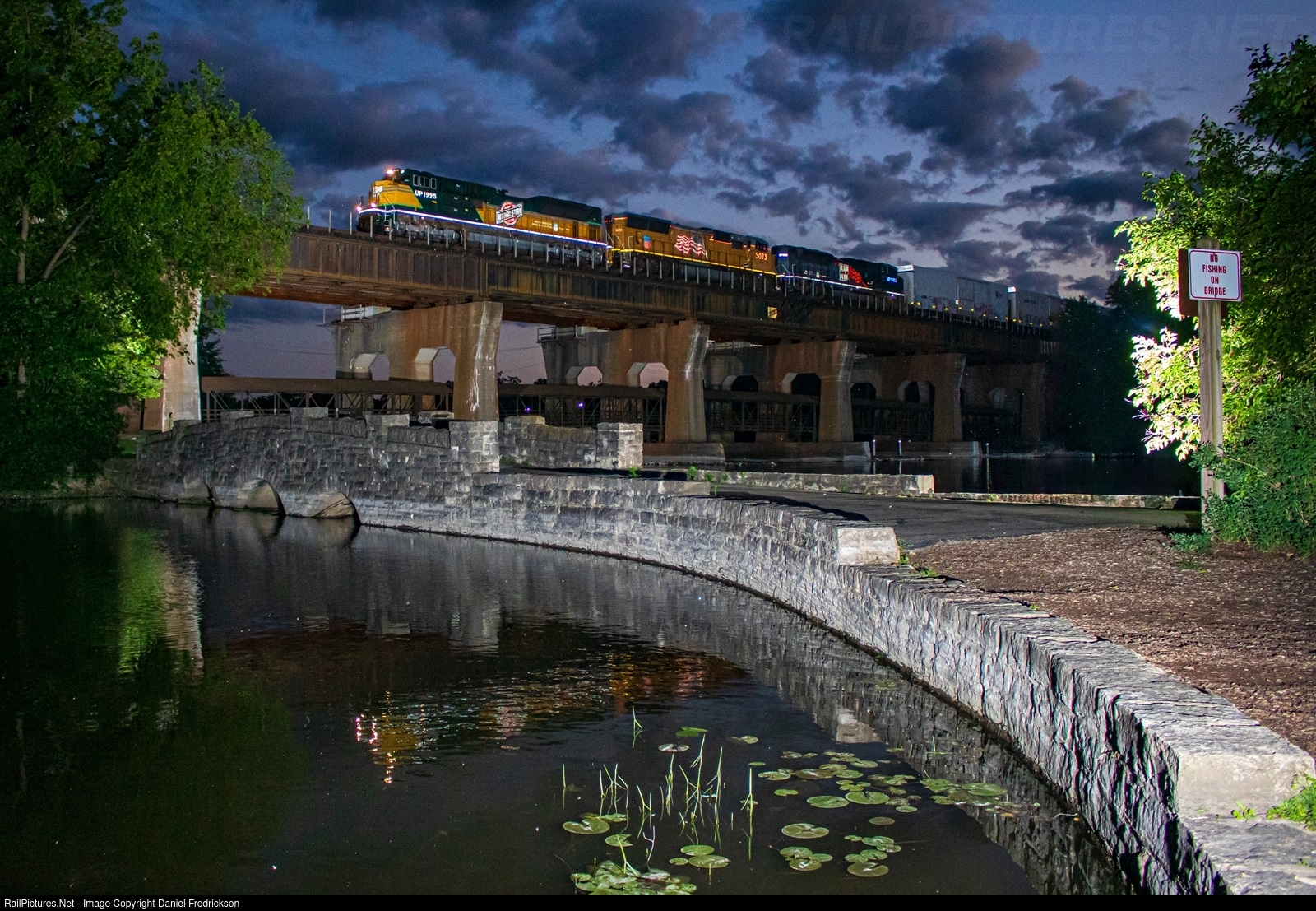 UP 1995, the Chicago & Northwestern heritage unit, has been assigned to the MWGWG West Chicago-Rochelle turn for roughly the past week. Here, a rendition of that train passes over the former C&NW bridge over the Fox River in Geneva, IL during a pleasant early June evening. Notice UP 1983 third out on the train, which was picked up at Global 3 in Rochelle after leading MGBG3 there earlier in the day.