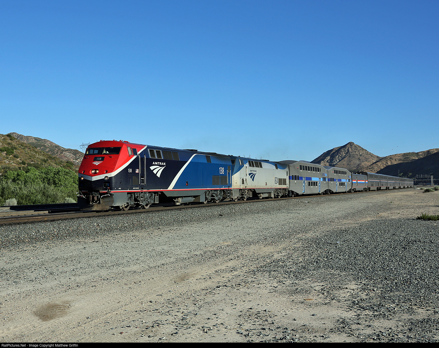 | AMTK 138 in new Phase VII paint leads a late #3 at Cajon. Also behind the power, 2 new Metrolink cars being delivered for service. |