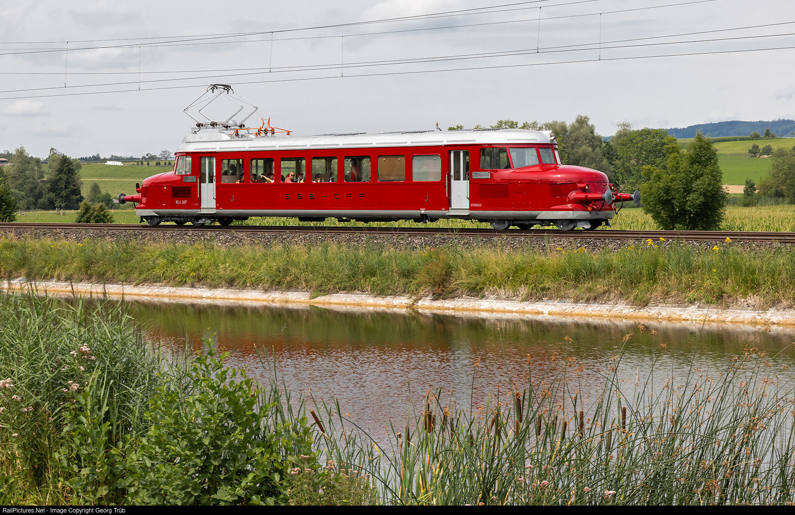 "Red Arrow" RCe 2/4 # 607 of the Oensingen-Balsthal-Bahn, brought back in the appearance of the 1950', is running along the pond at Riedt between Sulgen and Erlen. The iconic vehicle is on a charter journey through eastern part of Switzerland, from Wallisellen via Winterthur-Gossau-Bischofszell-Sulgen to Romanshorn, and later via Kreuzlingen-Stein am Rhein-Ossingen-Winterthur back to Wallisellen. The "Red Arrow" RCe 2/4 # 607 was delivered to the SBB in 1938 as last of 7 similar railcars. Originally, these railcars with 3rd class seats were intended for use at off-peak times and on branch lines. However, these connections quickly became so popular that their capacity became too small. In 1949, therefore, conventional buffers/couplings were added to carry up to two trailer coaches. The only interior conversion was carried out in 1955/56 in the SBB workshop in Zurich: among other things, the rail speedster was fitted with new comfortable upholstered seats with fold-down backrests and longitudinal luggage racks and from then on was primarily used for social travel. After being purchased by OeBB in 1974, the red railcar became the "Blue Arrow". However, during the 1988/89 overhaul at the BLS Lötschbergbahn in Spiez, it turned red again and during the 2022/23 overhaul, the exterior of the railcar was restored to its mid-1950s condition to match its interior. As a result, it is now the only original "Red Arrow" that is operational and can be hired for special trips. SBB Historic has the similar RAe 2/4 # 1001.