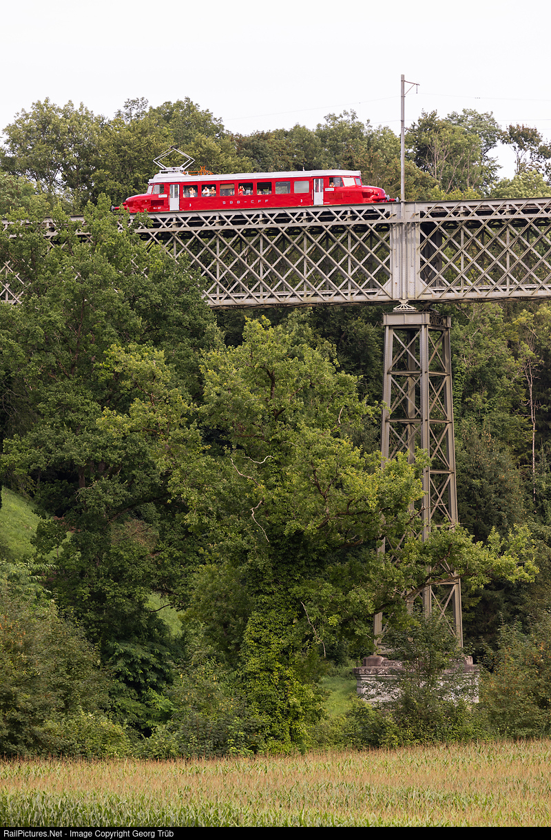 Red Arrow" RCe 2/4 # 607 of the Oensingen-Balsthal-Bahn, brought back in the appearance of the 1950', is crossing the 42 meter high and 338 meter long bridge over the Thur river between Ossingen and Thalheim-Altikon. The bridge was built between 1874 and 1875 for the Schweizerische Nationalbahn (SNB). In 1905 and 1906, the original tubular iron pillars were replaced by a half-timbered structure. The iconic "Red Arrow" is on charter journey through eastern part of Switzerland, from Wallisellen via Winterthur-Gossau-Bischofszell-Sulgen to Romanshorn, and later via Kreuzlingen-Stein am Rhein-Ossingen-Winterthur back to Wallisellen. The "Red Arrow" RCe 2/4 # 607 was delivered to the SBB in 1938 as last of 7 similar railcars. Originally, these railcars with 3rd class seats were intended for use at off-peak times and on branch lines. However, these connections quickly became so popular that their capacity became too small. In 1949, therefore, conventional buffers/couplings were added to carry up to two trailer coaches. The only interior conversion was carried out in 1955/56 in the SBB workshop in Zurich: among other things, the rail speedster was fitted with new comfortable upholstered seats with fold-down backrests and longitudinal luggage racks and from then on was primarily used for social travel. After being purchased by OeBB in 1974, the red railcar became the "Blue Arrow". However, during the 1988/89 overhaul at the BLS Lötschbergbahn in Spiez, it turned red again and during the 2022/23 overhaul, the exterior of the railcar was restored to its mid-1950s condition to match its interior. As a result, it is now the only original "Red Arrow" that is operational and can be hired for special trips. SBB Historic has the similar RAe 2/4 # 1001.