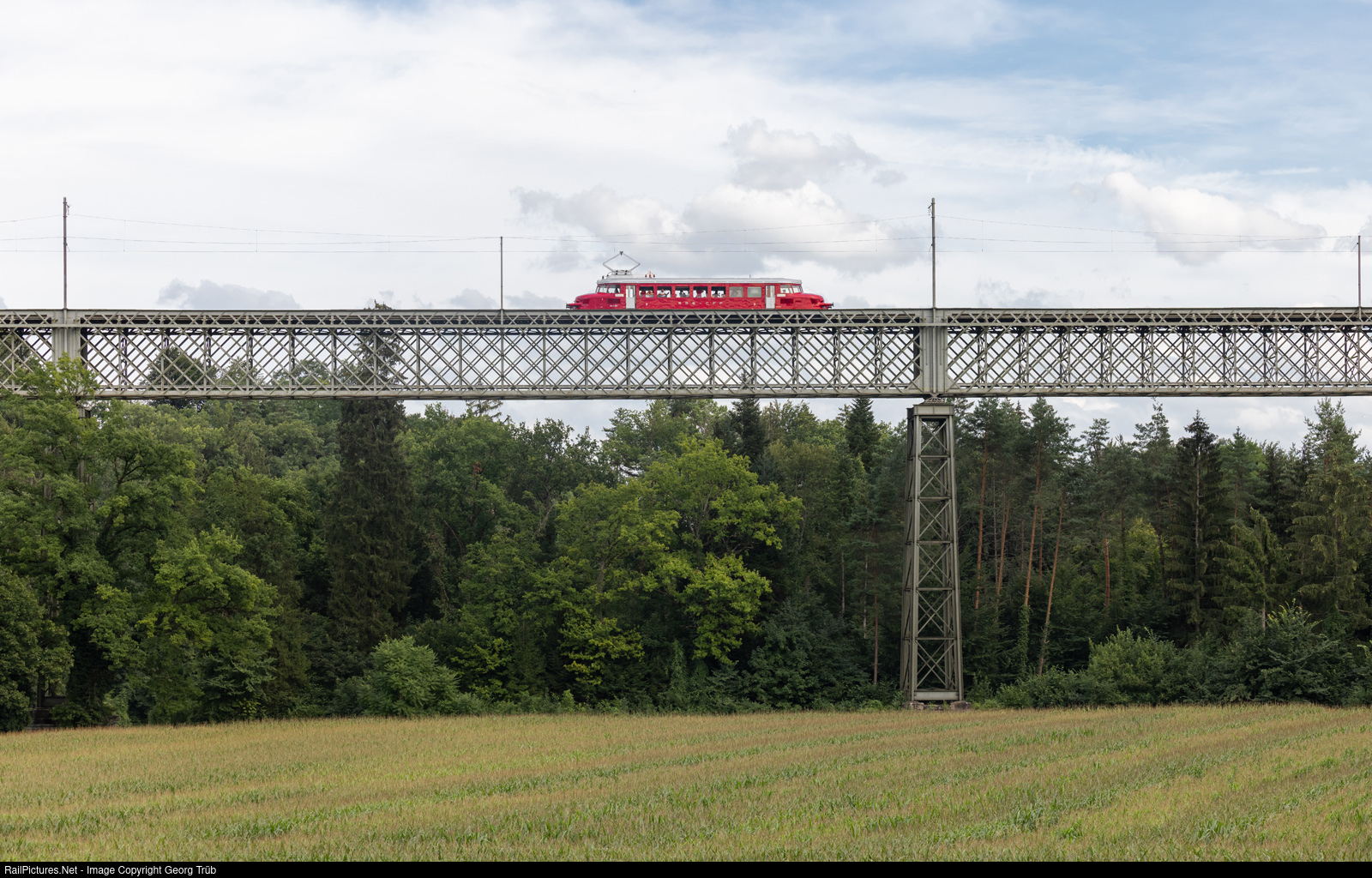 Red Arrow" RCe 2/4 # 607 of the Oensingen-Balsthal-Bahn, brought back in the appearance of the 1950', is crossing the 42 meter high and 338 meter long bridge over the Thur river between Ossingen and Thalheim-Altikon. The bridge was built between 1874 and 1875 for the Schweizerische Nationalbahn (SNB). In 1905 and 1906, the original tubular iron pillars were replaced by a half-timbered structure. The iconic "Red Arrow" is on charter journey through eastern part of Switzerland, from Wallisellen via Winterthur-Gossau-Bischofszell-Sulgen to Romanshorn, and later via Kreuzlingen-Stein am Rhein-Ossingen-Winterthur back to Wallisellen. The "Red Arrow" RCe 2/4 # 607 was delivered to the SBB in 1938 as last of 7 similar railcars. Originally, these railcars with 3rd class seats were intended for use at off-peak times and on branch lines. However, these connections quickly became so popular that their capacity became too small. In 1949, therefore, conventional buffers/couplings were added to carry up to two trailer coaches. The only interior conversion was carried out in 1955/56 in the SBB workshop in Zurich: among other things, the rail speedster was fitted with new comfortable upholstered seats with fold-down backrests and longitudinal luggage racks and from then on was primarily used for social travel. After being purchased by OeBB in 1974, the red railcar became the "Blue Arrow". However, during the 1988/89 overhaul at the BLS Lötschbergbahn in Spiez, it turned red again and during the 2022/23 overhaul, the exterior of the railcar was restored to its mid-1950s condition to match its interior. As a result, it is now the only original "Red Arrow" that is operational and can be hired for special trips. SBB Historic has the similar RAe 2/4 # 1001.