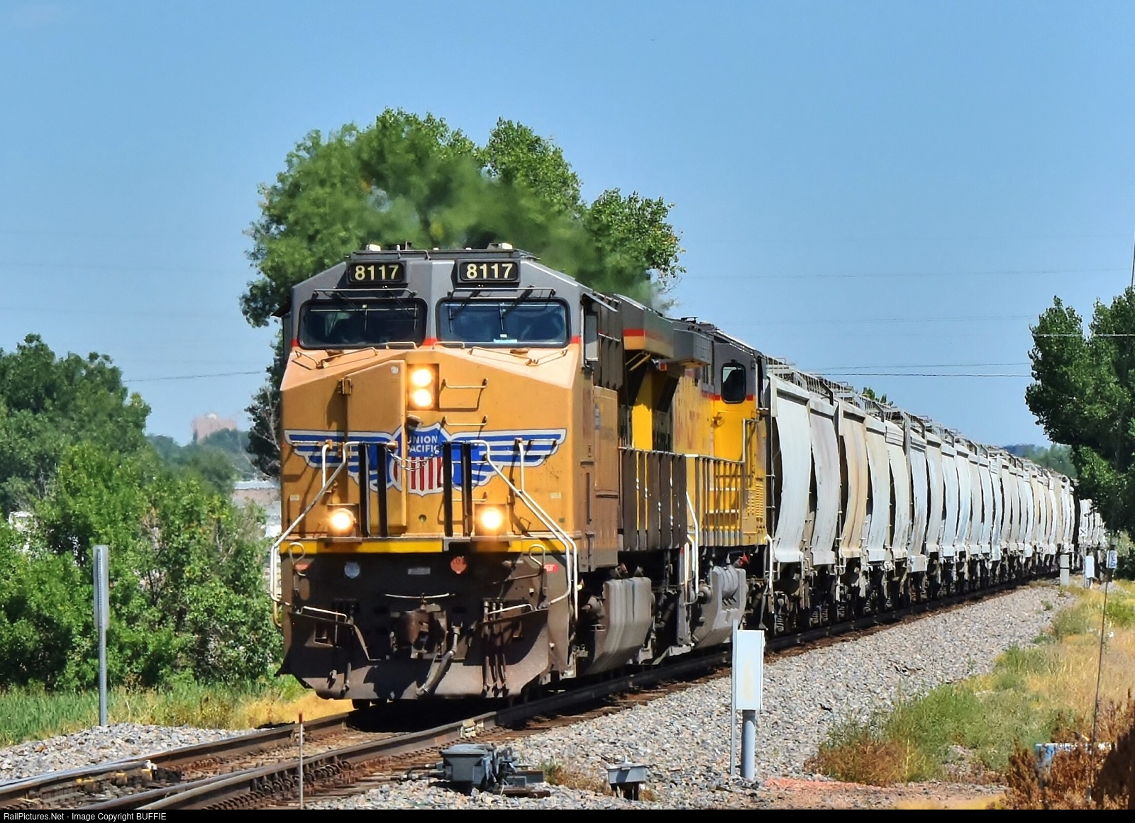 UP 8117 (ES44AC) leads a load of hoppers through LaSalle, Colorado on the Greeley Sub.