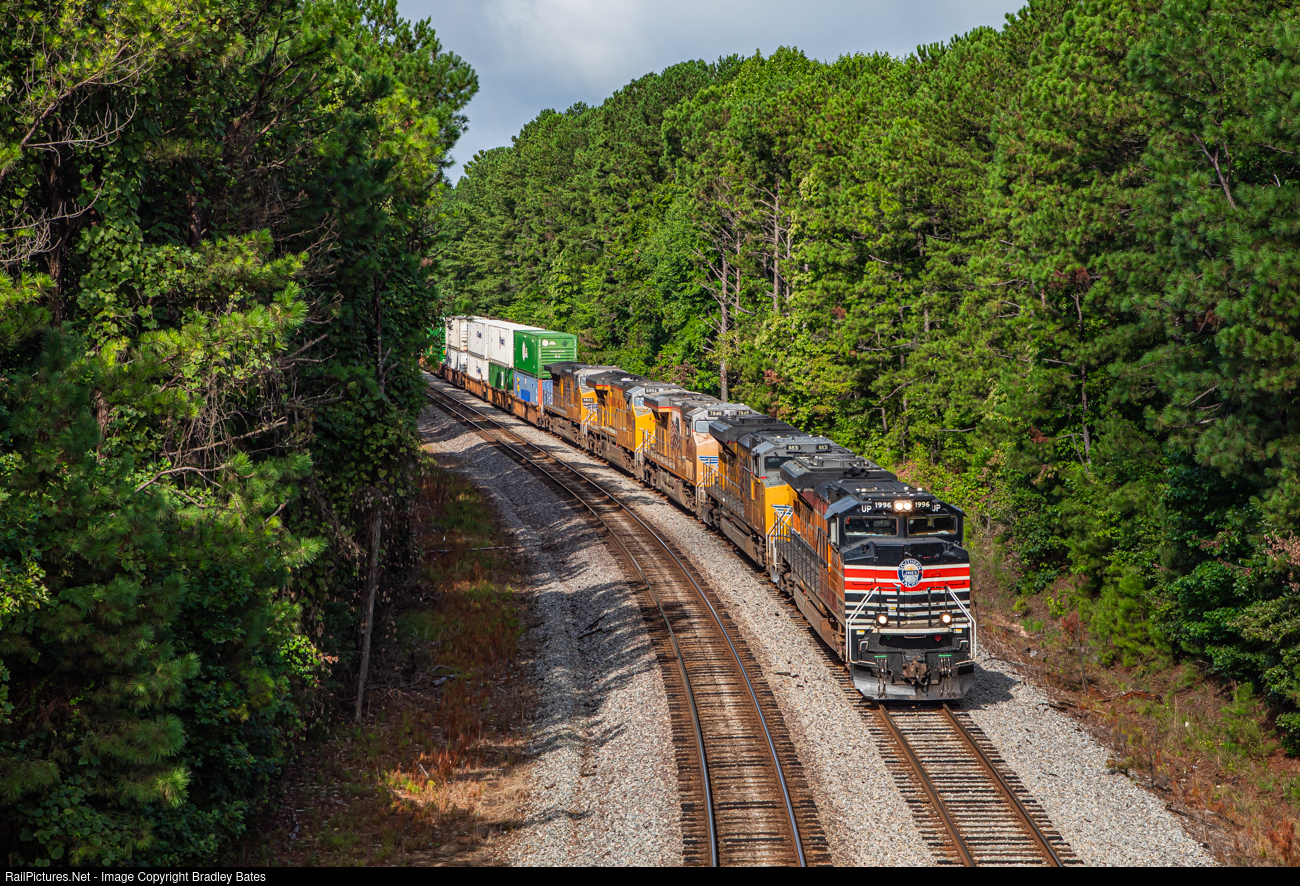 | Norfolk Southern Train 28J eases to a stop at CP Sewell in Bremen, GA. for a meet with AMTK 19 before proceeding eastbound to Atlanta with UP's Southern Pacific heritage locomotive #1996 on the point. |