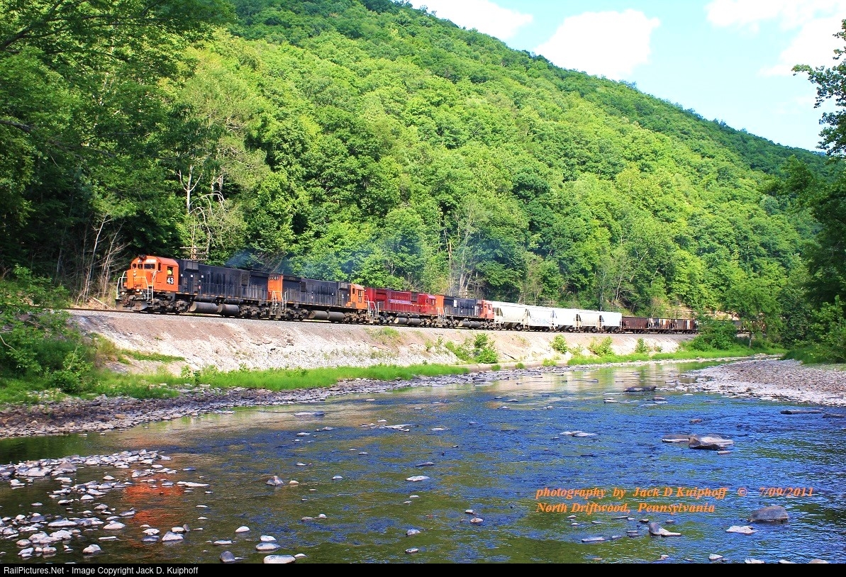 | WNY&P 43-41-630-637, with the DFT north along the Sinnemahoning Creek at N. Driftwood, Pennsylvania. July 9, 2001. Jack D Kuiphoff © photo |