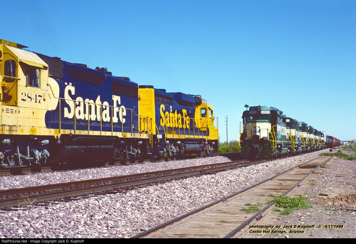 | ARZC 3001-3503-3004-3003-3803-3804 swaps out the 807e with 708w from the ATSF 2729-2847 at Castle Hot Springs, Wickenburg, Arizona. April 17, 1998. Jack D Kuiphoff © photo |