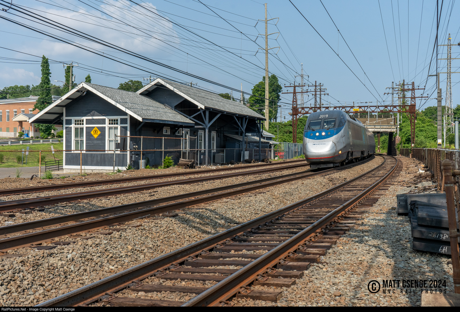 Amtrak Acela power car 2019 is seen leading train 2255 through Darien, Connecticut, seen passing the former Noroton Heights Station. The station was rebuilt in the early 1970s replacing the low-level platforms with high-level ones on tangent track further west. This building had been faced with demolition in 1989, but was saved by local residents and turned into "The Depot," a youth center.