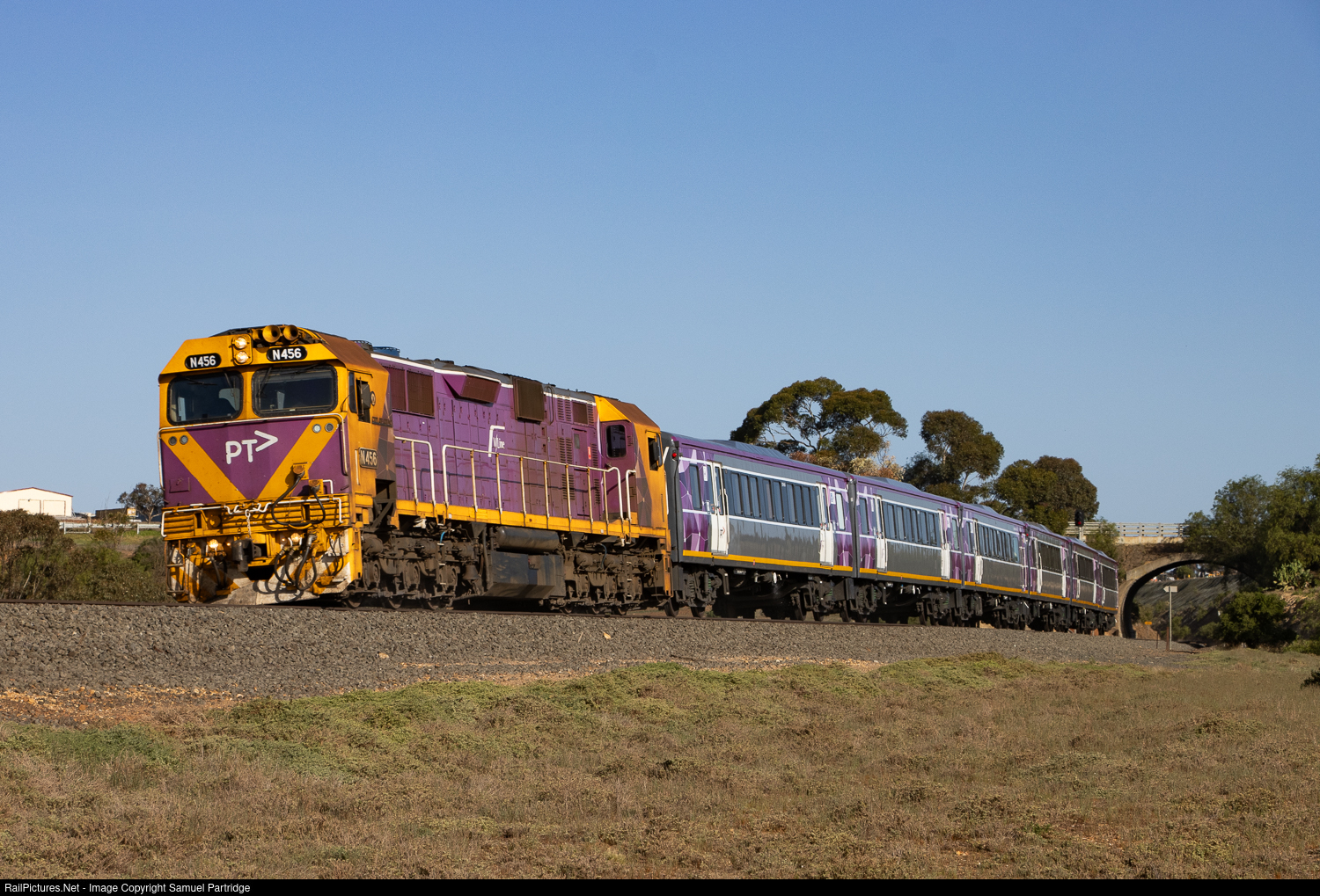 | V/Line Passenger's N456 leads now scrapped carriage set SSH23 on 8257 shuttle service from Melton to Bacchus Marsh, a continuation of the original service from Southern Cross, which was held at Melton to let another train overtake. This train is seen leaning around the sweeping Bull Farm Curves on the approach to Bacchus Marsh |