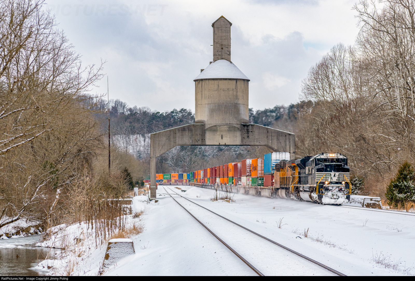 NS 234 passes under the former N&W coaling tower in Vicker, VA on the NS Christiansburg District.