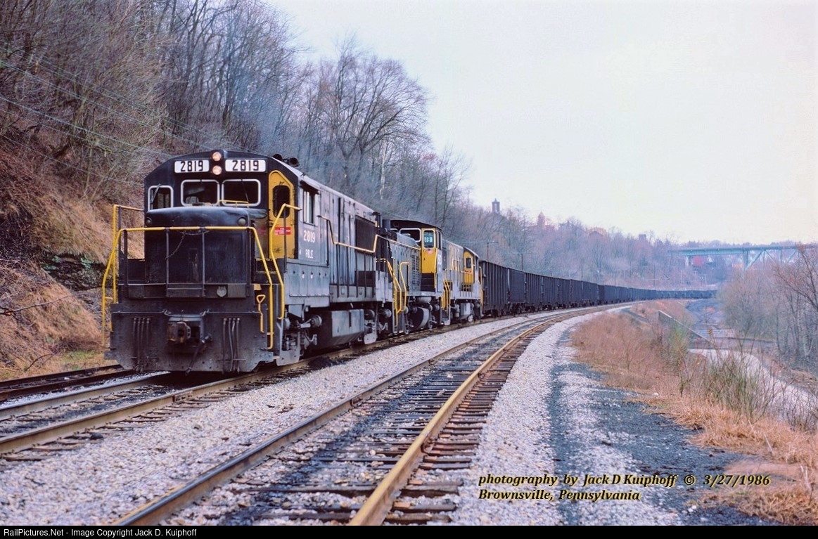 | Pittsburgh and Lake Erie, P&LE U28B 2819 -MP15DC 1593 -U28B 2818, northbound coal on the Monongahela Railway at Brownsville, Pennsylvania. March 27, 1986. Jack D Kuiphoff © photo