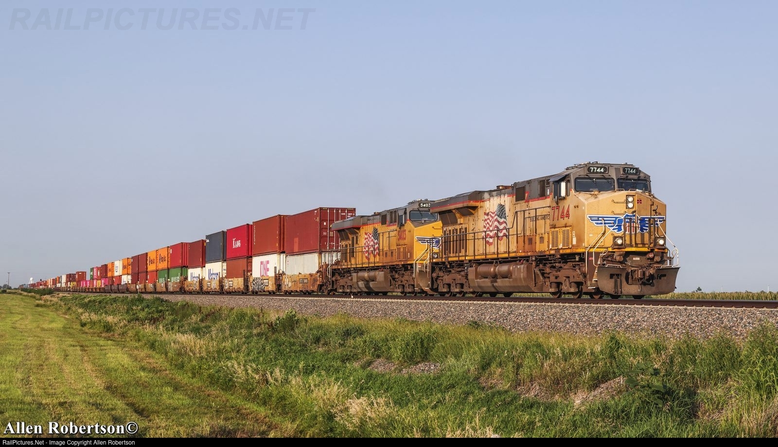 UP 7744 & 5403 power westbound stacks.