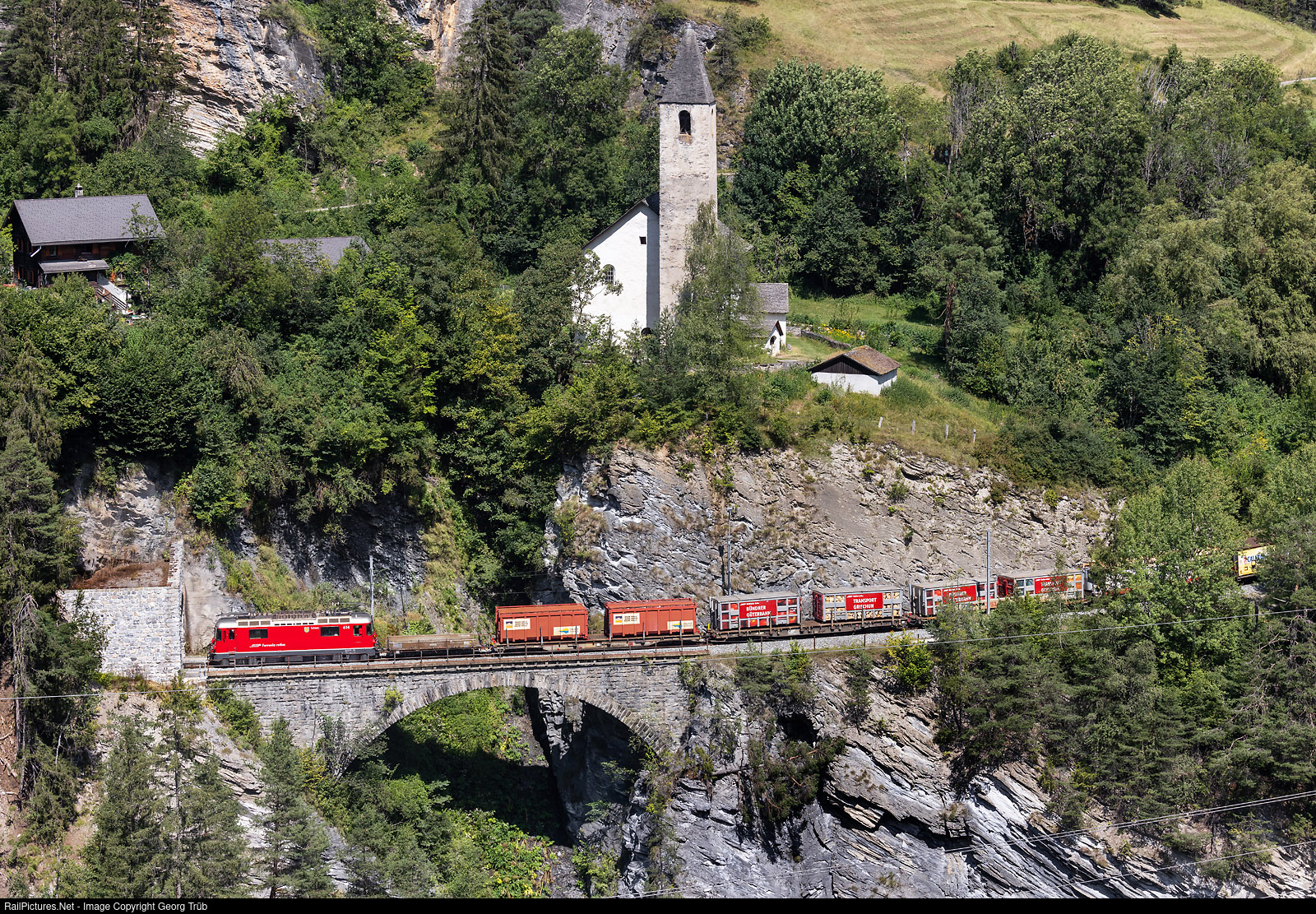 | Freight train 5152 of the Rhaetian Railway from Samedan to Landquart freight yard with Ge 4/4 II # 614 is crossing the 32 meter long Mistailtobel bridge and entering the 300 meter long Mistail tunnel in the Schin gorge between Tiefencastel and Solis on the Albula line. Above is the church of St. Peter Mistail, a Carolingian three-apsidal church in Alvaschein dating from the 9th century. |