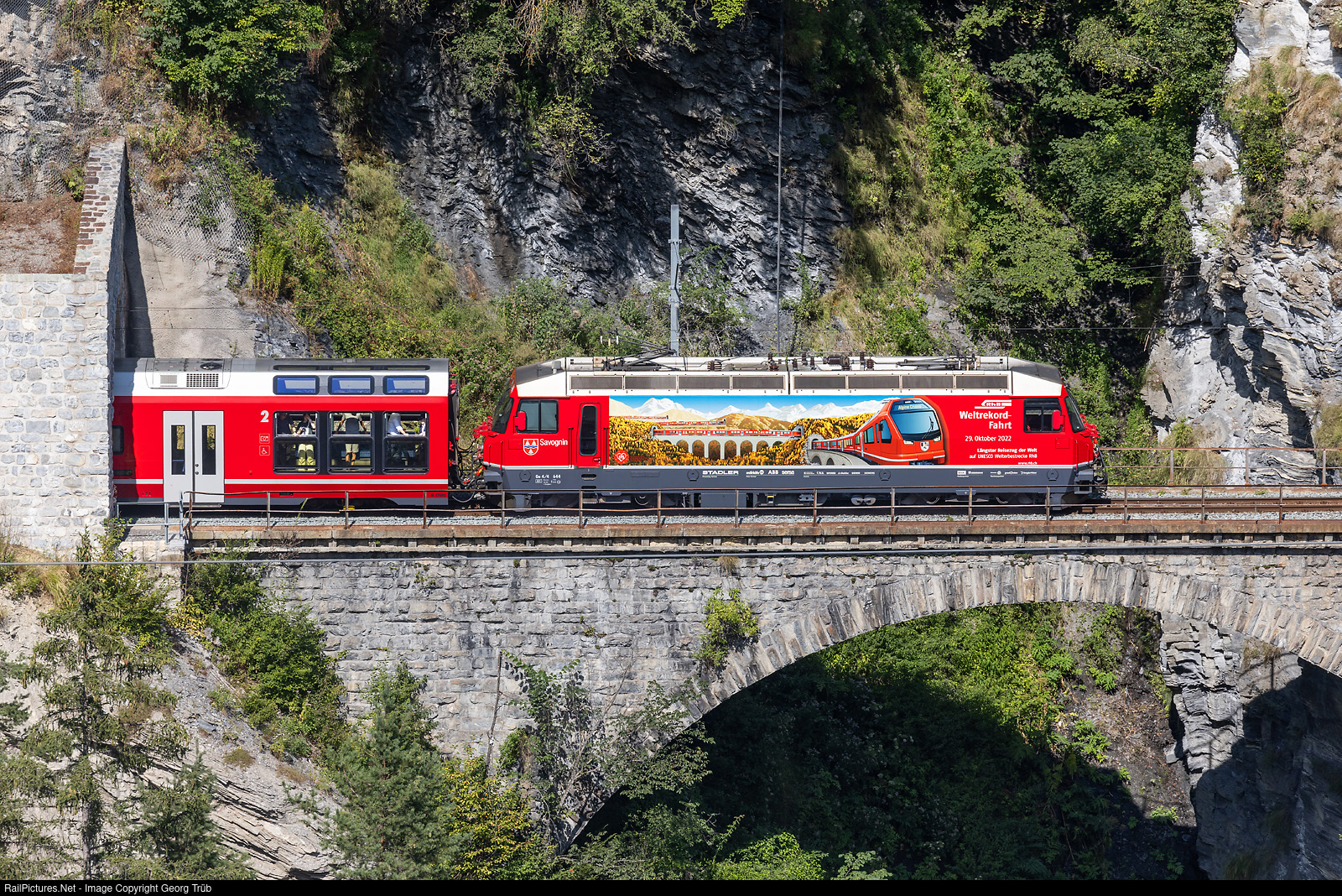 Ge 4/4 III # 644 of the Rhaetian Railway, in the publicity paint scheme for the world's longest narrow gauge passenger train on october 29th, 2022, is leaving the 300 meter long Mistail tunnel and crossing the 32 meter long Mistailtobel viaduct in the Schin gorge between Solis and Tiefencastel, pulling the IR 1149 of the line IR38 from Chur over the Albula line to St.Moritz. The windows in the photographer compartment of the ALVRA trainset are opened. Compare with photo https://www.railpictures.net/photo/807352/