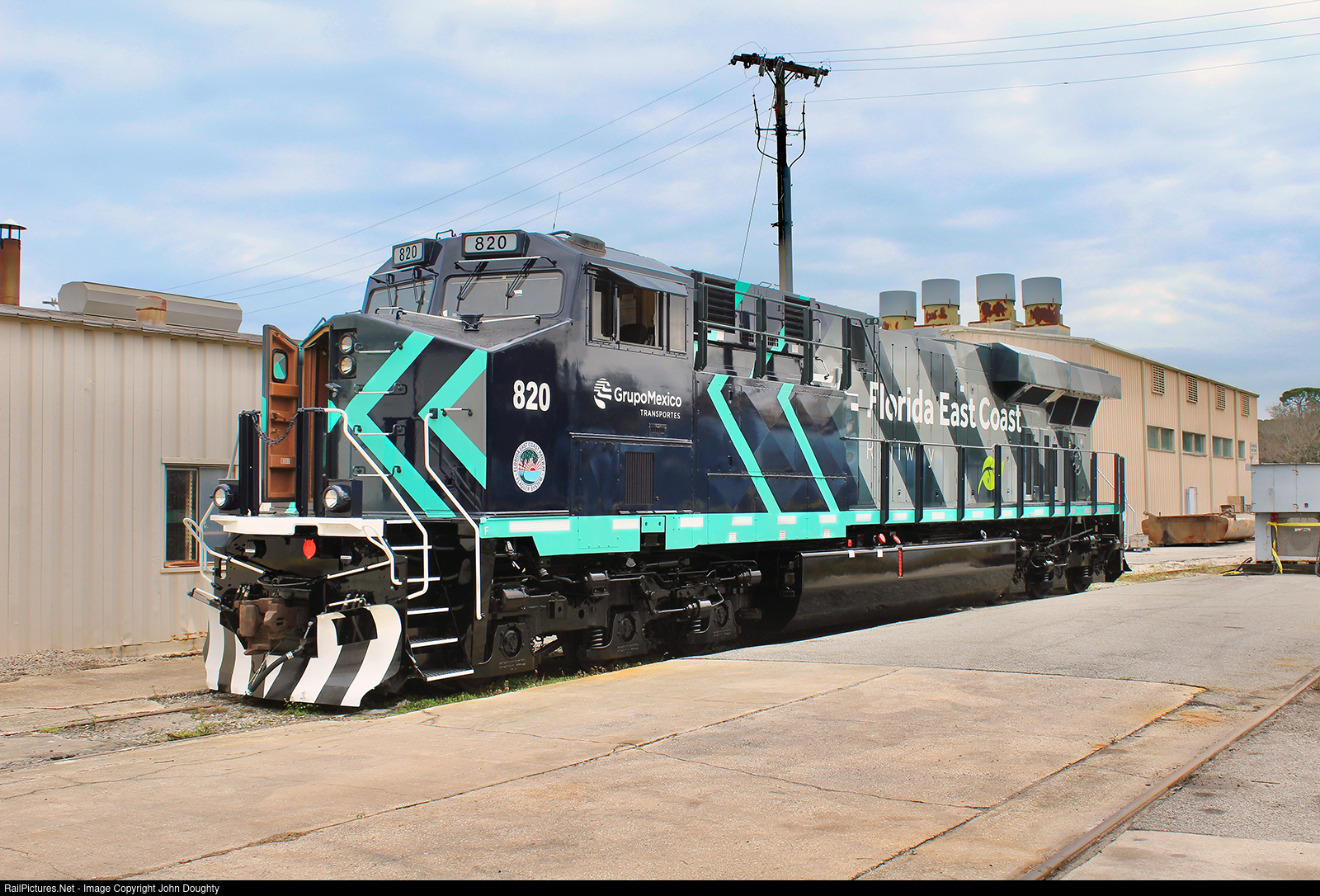 | FEC 820 shows off the GrupoMexico blue, teal and gray paint scheme. The paint design is similar to the Ferromex red and gray paint scheme. The FEC 820 was part of an unveiling ceremony for employees and guests last January, 2024 at the Florida East Coast Railway New Symrna Beach diesel shops. Photo taken with permission. |