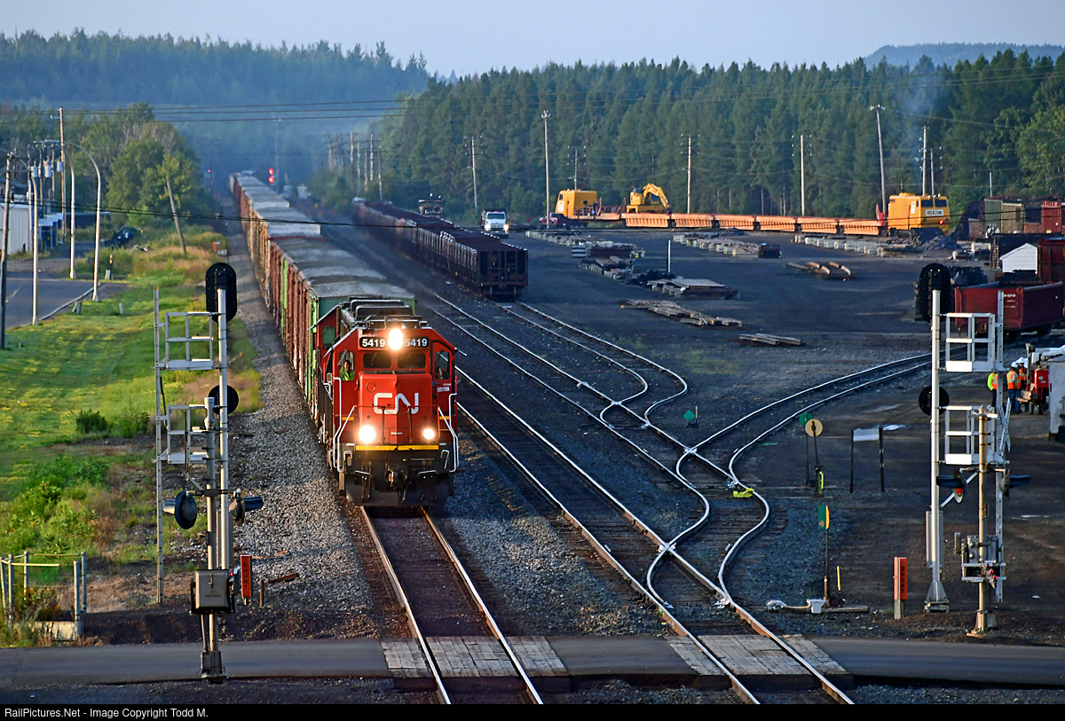 Early morning finds CN 5419 pulling through Virginia and track speed while a CN MOW crew has a job briefing and a Loram work train gets fired up for the day.