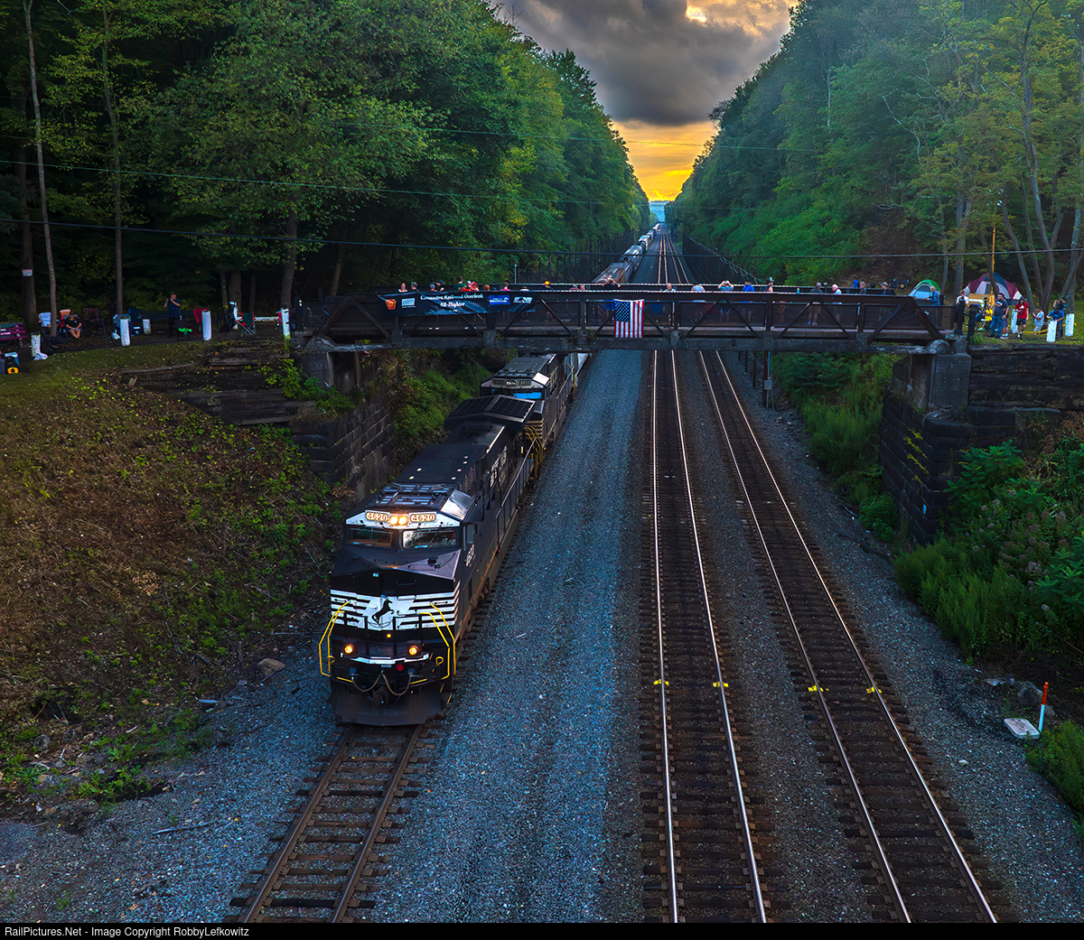 A large gathering of rail buffs congregate on the Cassandra Bridge, as the 2024 version of the Cassandra All-Nighter is in full swing. As the sun begins to set, a heavy and loud NS 18N manifest charges past the gang up main one. |