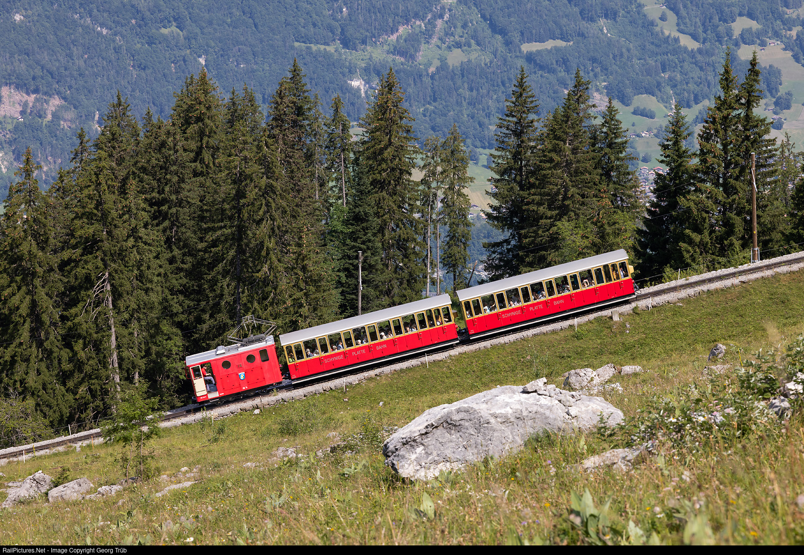 | This day, train 651 of the Schynige Platte-Bahn with departure time of 10.45 AM from Wilderswil was run with three sections due to high demand. Cogwheel locomotive He 2/2 # 16 "Anemone", built in 1910 by SLM and Alioth as # 56 for the Wengernalpbahn and transfered to the SPB in 1963, is shoving the third composition up the mountain between Breitlauenen and Schynige Platte. |