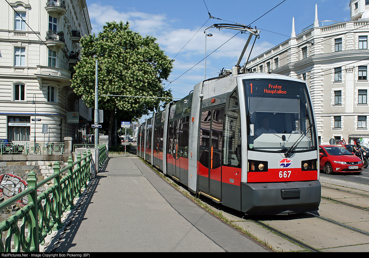 | An ULF has just made a stop at Julius Raab Platz and is now crossing the Wienfluss. The ULF (Ultra Low Floor) models and variants are the main workhorse for the Trams here in Wien. |