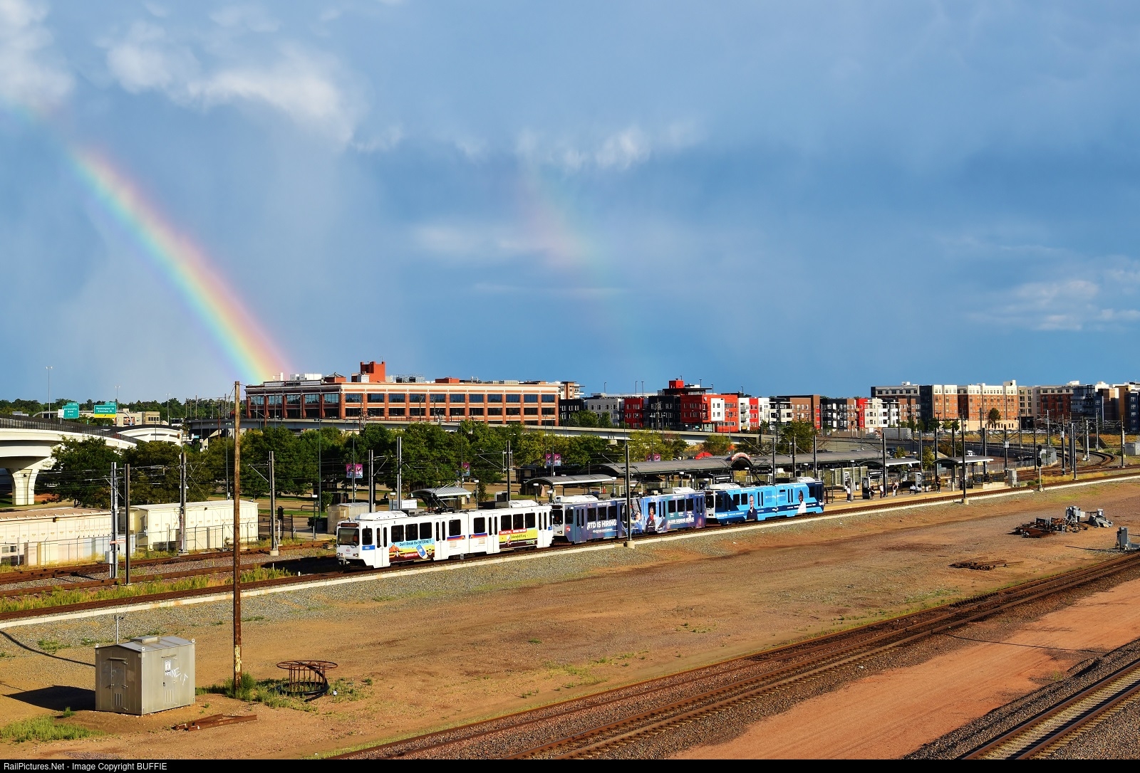 | A double rainbow shines over the RTD Broadway Station in Denver, Colorado as light rail train #254 picks up and drops off passengers.