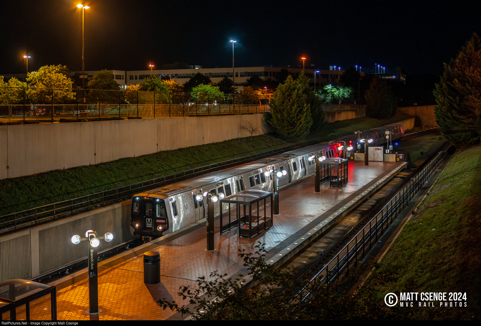 Metro After Dark. A Washington Metropolitan Area Transit Authority (WMATA) Metrorail train led by 7000-series car 7012 is seen passing through Branch Avenue station shortly after the station closed for the night. The 4-car train was not in service, and was coming out of the nearby Branch Avenue Yard.