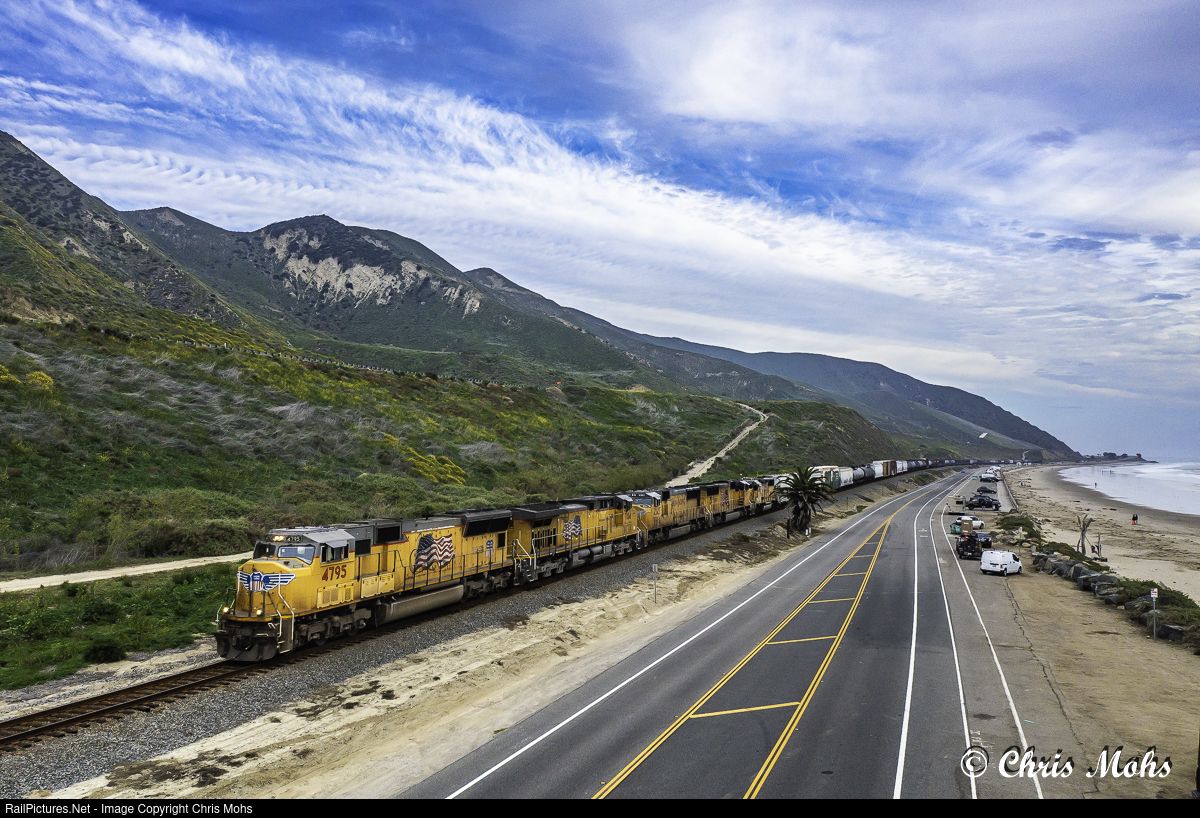 | Clouds move in off the Pacific Ocean and over Ventura on the Santa Barbara Subdivision on a late afternoon. The Northbound Guadalupe local with Union Pacific SD70ACe no. 4795 leading rolls the Local along Solimar Beach and onward up the coast with a nice train.