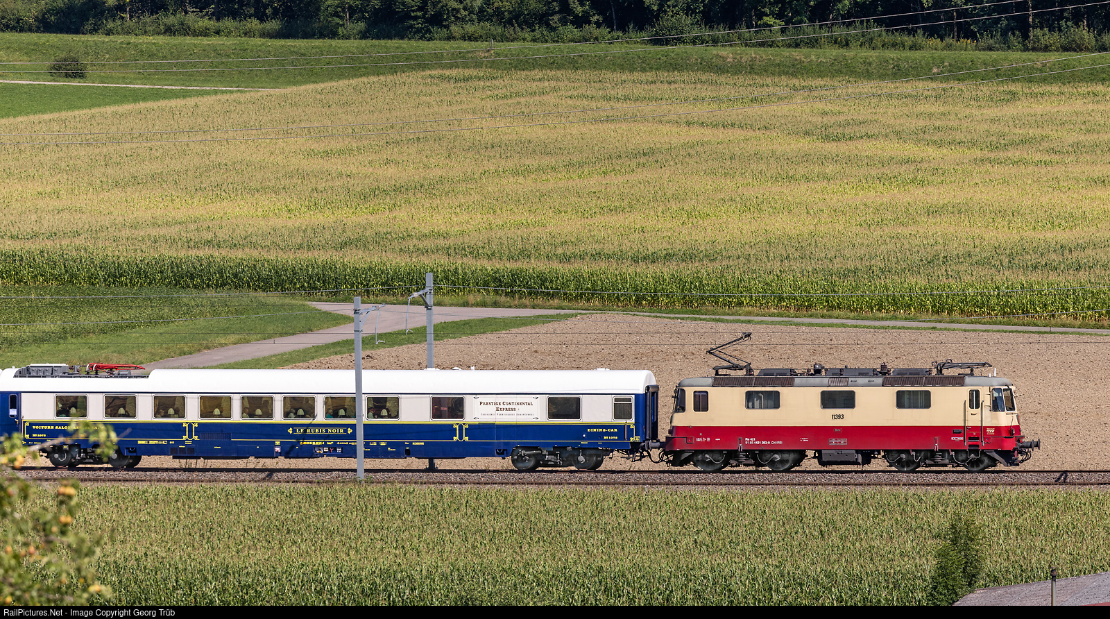 | Traditional dining car tour of the "TEE Classics" association on the Saturday of the Street Parade in Zurich. Re 421 # 393 (Re 4/4 II # 11393) of IRSI (International Rolling Stock Investment AG) pulls the train 5320 "TRANS EUROP EXPRESS Foret Noir" between Hüttlingen-Mettendorf and Müllheim-Wigoltingen. The journey with the three coaches of the Prestige Continental Express (PCE) runs from Winterthur via Weinfelden-Konstanz-Singen am Hohentwiel-Donaueschingen-Schwarzwaldbahn-Offenburg-Basel Badischer Bahnhof-Basel shunting yard-Laufenburg-Koblenz-Bülach back to Winterthur. The train run under TR TransRail in Switzerland and the NESA Gmbh in Germany.
