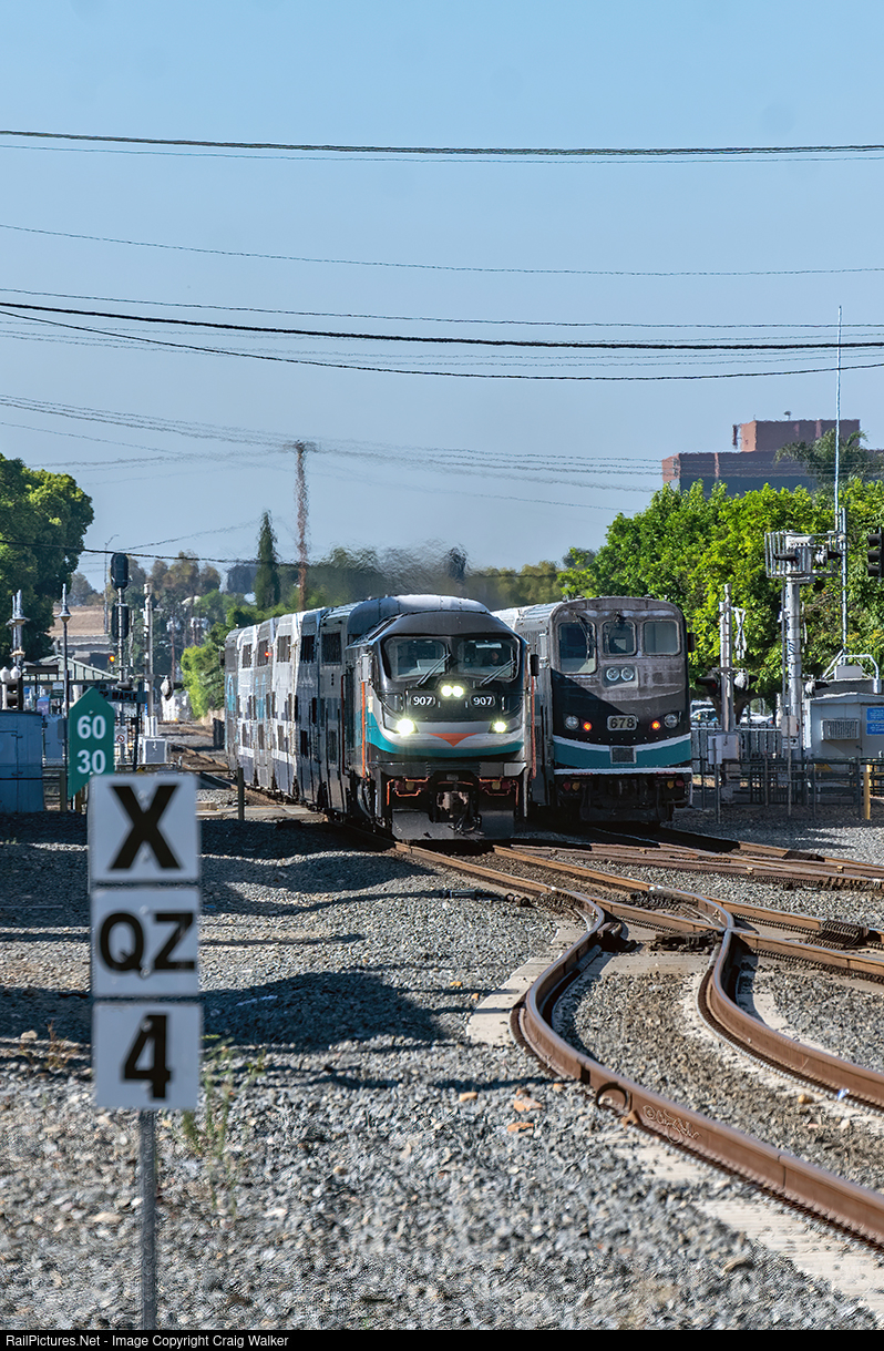 Meeting at the Metrolink station in Orange are two Metrolink trains – 800 on the left (Inland Empire-Orange County Line; Oceanside CA to Riverside-Downtown CA), and 600 on the right (Orange County Line; Los Angeles CA to Oceanside CA). northbound train 800 has F125 907 pulling six cars, while southbound train 600 has F125 935 hauling five cars. (Orange, California – July 29, 2024)