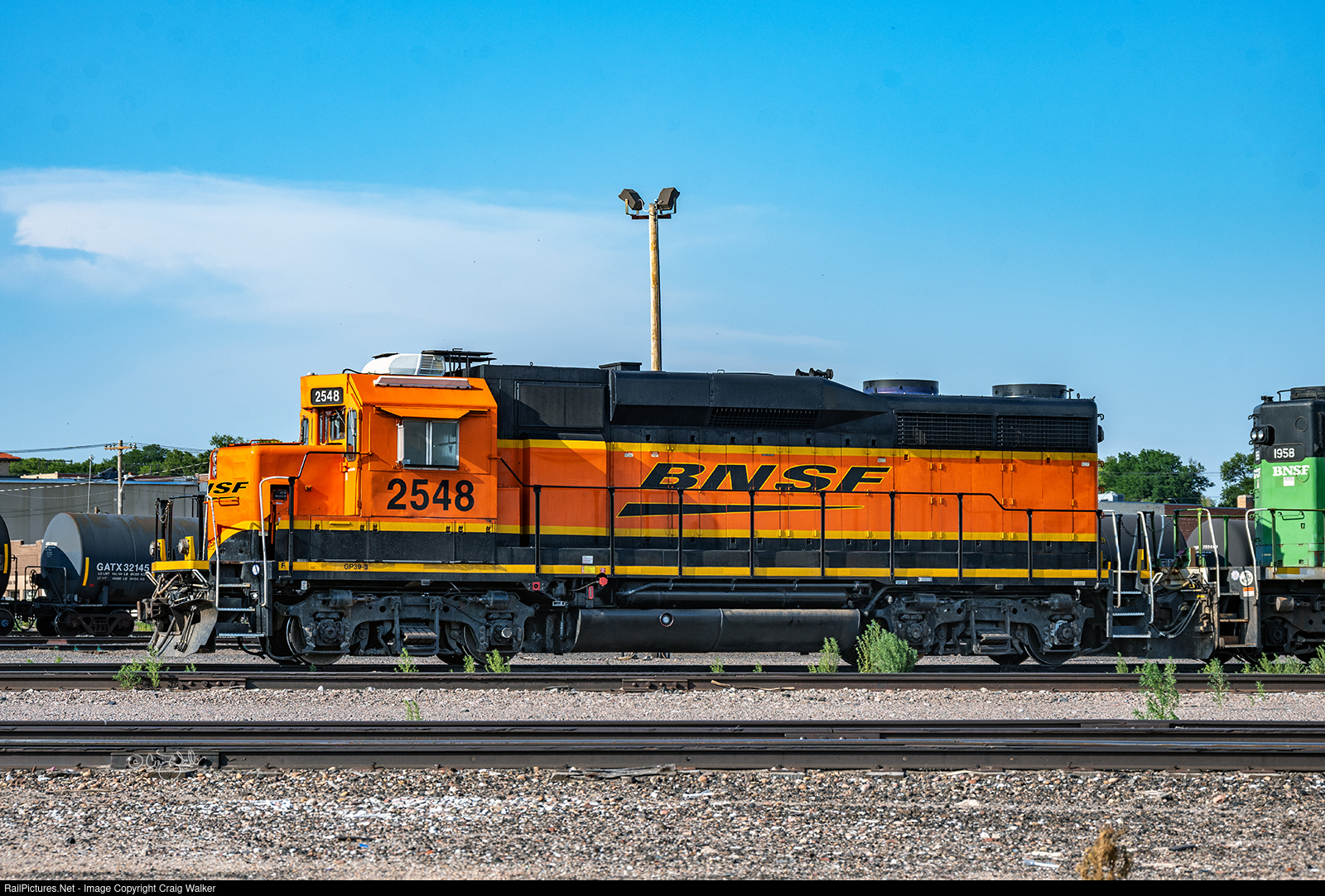 Having returned to McCook Yard for the day, BNSF Railway "GP39-3" 2548 (built by General Motors Electro-Motive Division in March 1963 as Atchison Topeka & Santa Fe GP30 1221, which was later renumbered ATSF 3221 and, later still, to ATSF 2721, later gaining a new identity through the merger with the BN as Burlington Northern Santa Fe 2431 and, after receiving a new cab, BNSF 2548) and SD40-2 1958 (also build by EMD, but in March 1972 as Colorado & Southern 903, which parent Burlington Northern later renumbered BN 6351, and later became BNSF 6377 thanks to the previously mentioned merger) layover for the night. (McCook, Nebraska – July 16, 2024)