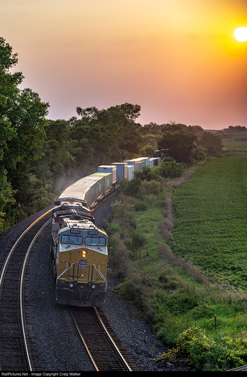 Union Pacific UPS Expedited Intermodal train ZG2BR-22 winds through the fields and heads into the setting sun as it makes its way from Proviso, Illinois' Global 2 to Brooklyn, Oregon (essentially Portland). This train has UP SD70ACe 9020, AC4400CW 6059, ES44ACs 7963 and 7730 on the head-end, with UP AC4400CW 5730 and UP AC6000CW 6903 as the rear Distributed Power Units (DPU). (Marshalltown, Iowa – July 22, 2024)