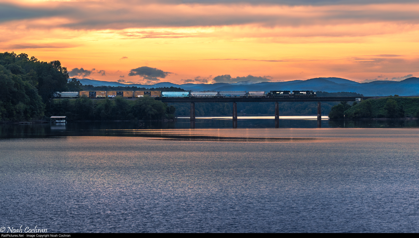 | As evening descends over the southern tip of the Blue Ridge Mountains and the piedmont of north Georgia below, NS GP60 sister units 7139 and 7138 split the Georgia/South Carolina state line as they bring NS P45 flying across the Tugaloo bridge. P45 is NS's Mon-Fri local turn from Toccoa, GA to interchange with the Pickens Railway in Anderson, SC.