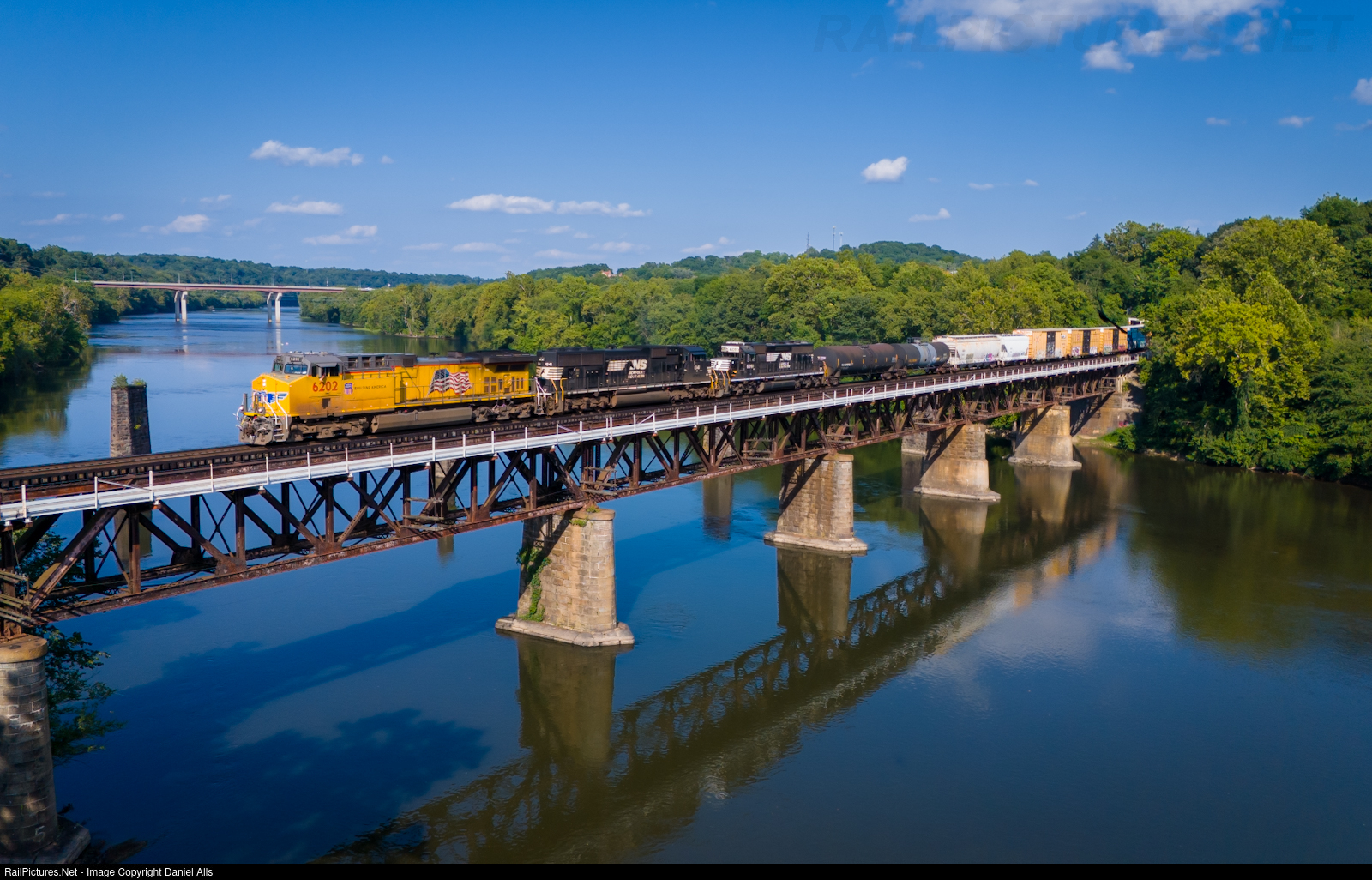 | After working Radford yard, NS 127 gets going west again. It’s seen here crossing over the New River with a Union Pacific leader. |